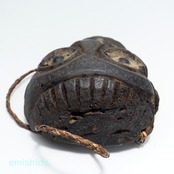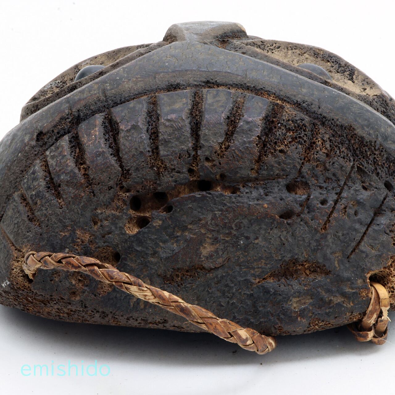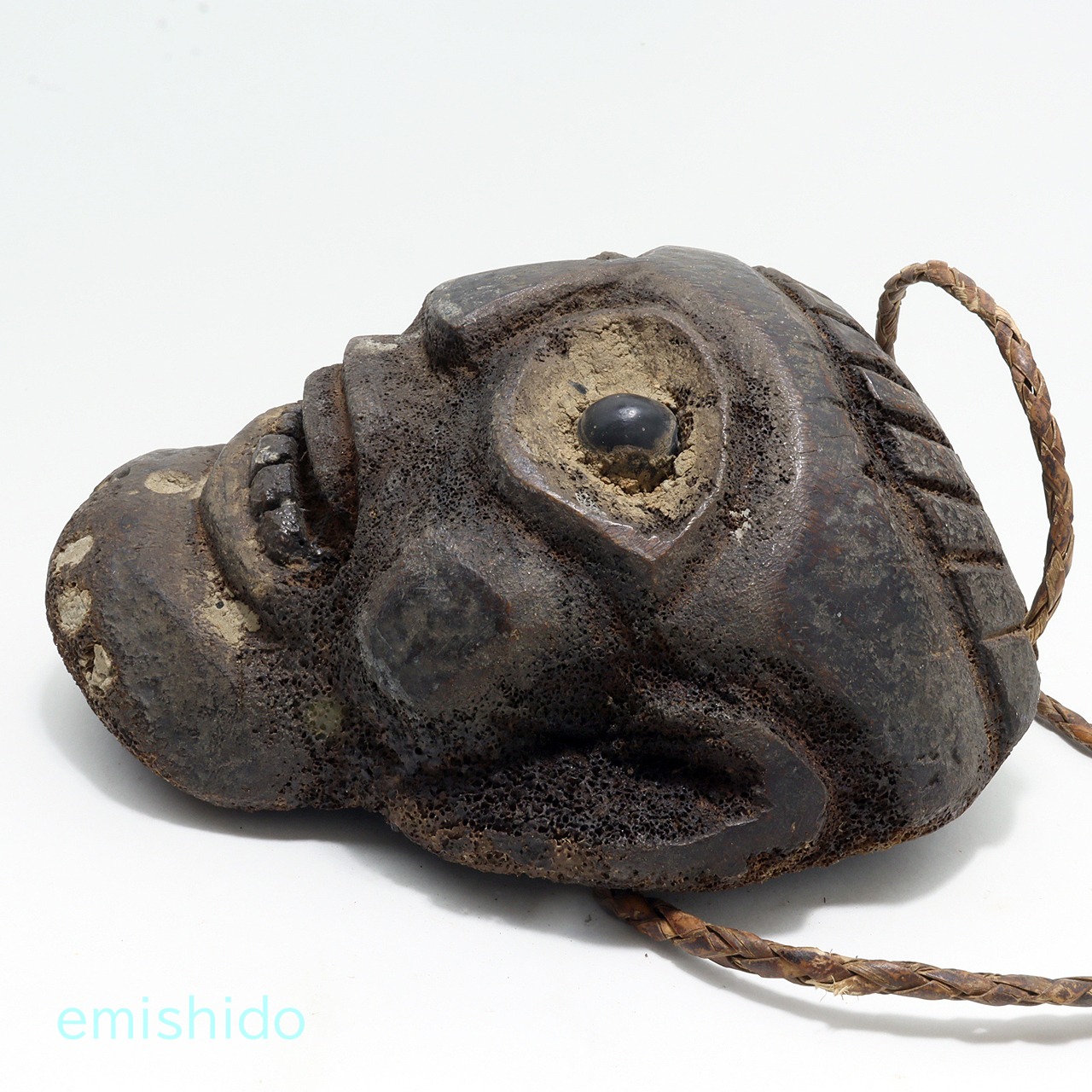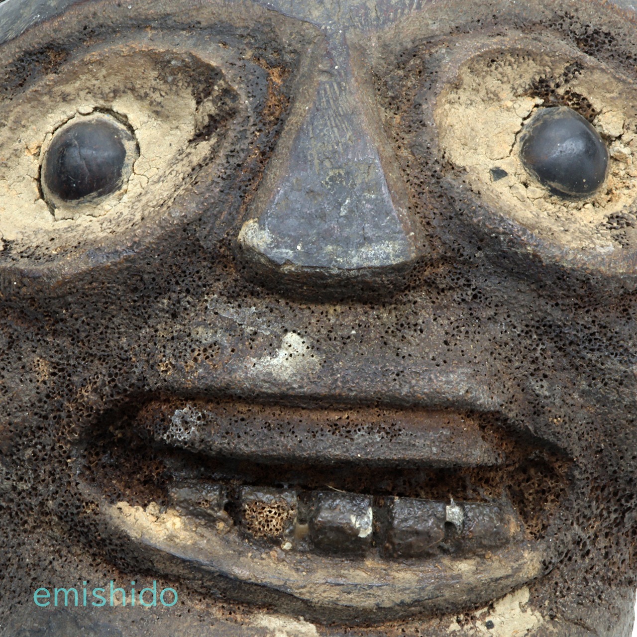 額とそれに続く鼻、頬に研磨したのか、滑らかな骨の表面を残して加工したのか、骨に特有のツブツブが消された処理が施されています。ナガ族のことだから顔面タトゥーを表わしているかもしれない。眼は「ムクロジ」の種子でドングリ眼、白い縁取りが不気味な印象を際立たせています。多分顎ヒゲも生えていたのでしょうが、抜け落ちて粘土状のもので塞がれています。