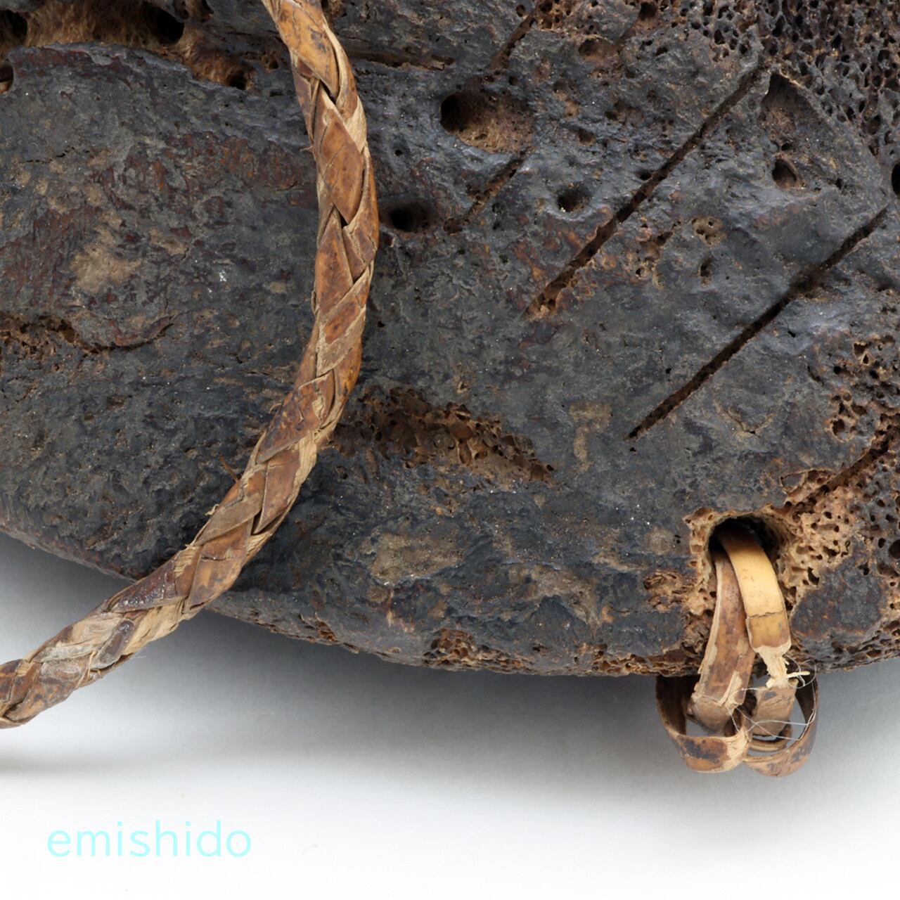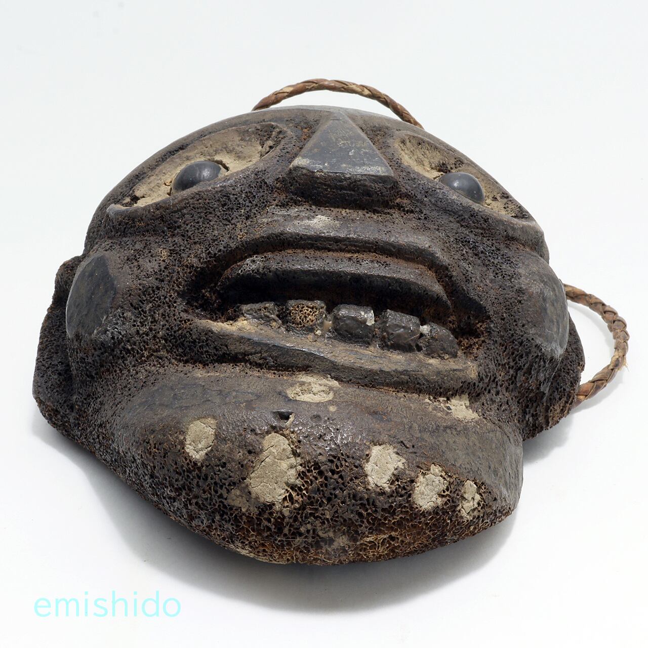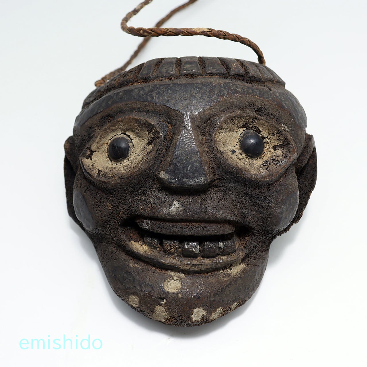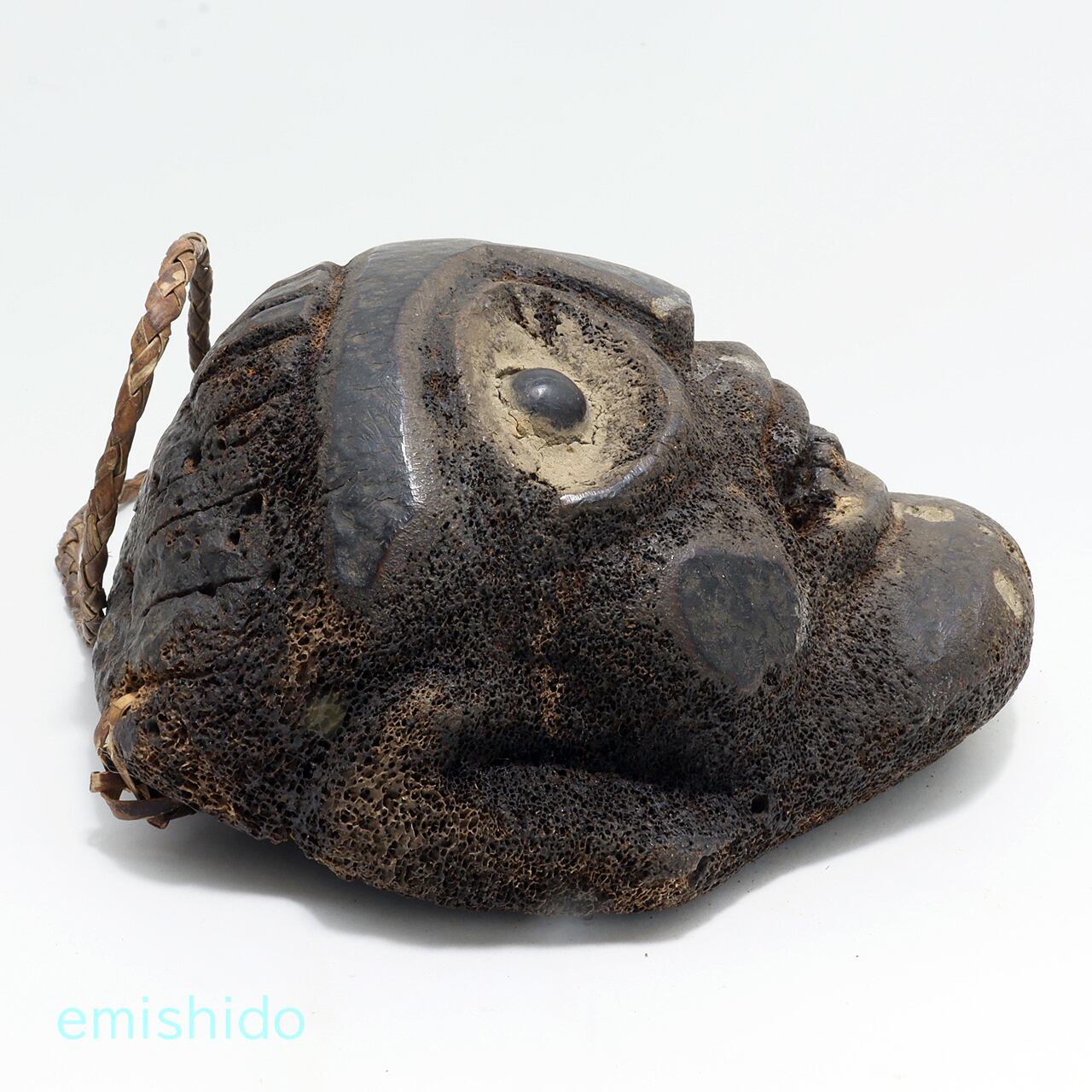 額とそれに続く鼻、頬に研磨したのか、滑らかな骨の表面を残して加工したのか、骨に特有のツブツブが消された処理が施されています。ナガ族のことだから顔面タトゥーを表わしているかもしれない。眼は「ムクロジ」の種子でドングリ眼、白い縁取りが不気味な印象を際立たせています。多分顎ヒゲも生えていたのでしょうが、抜け落ちて粘土状のもので塞がれています。