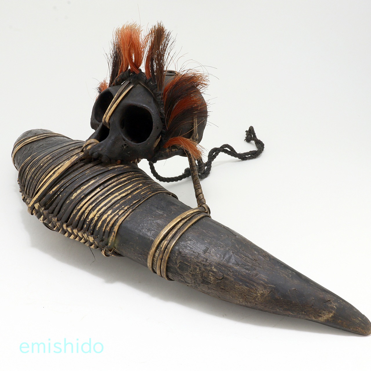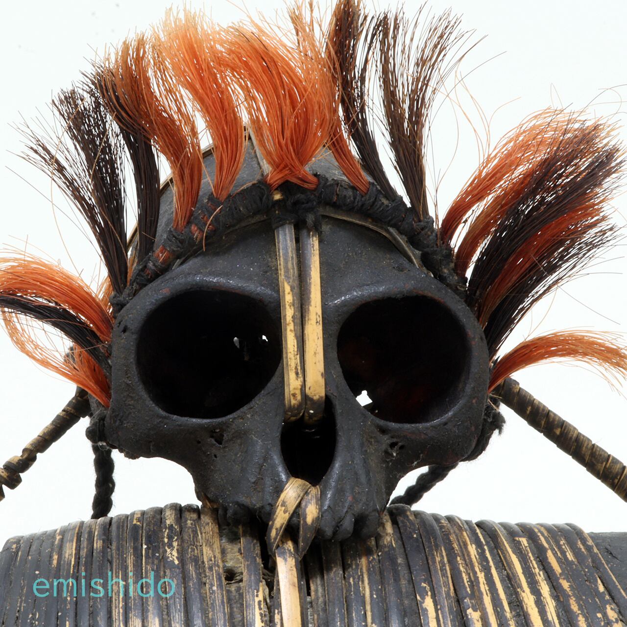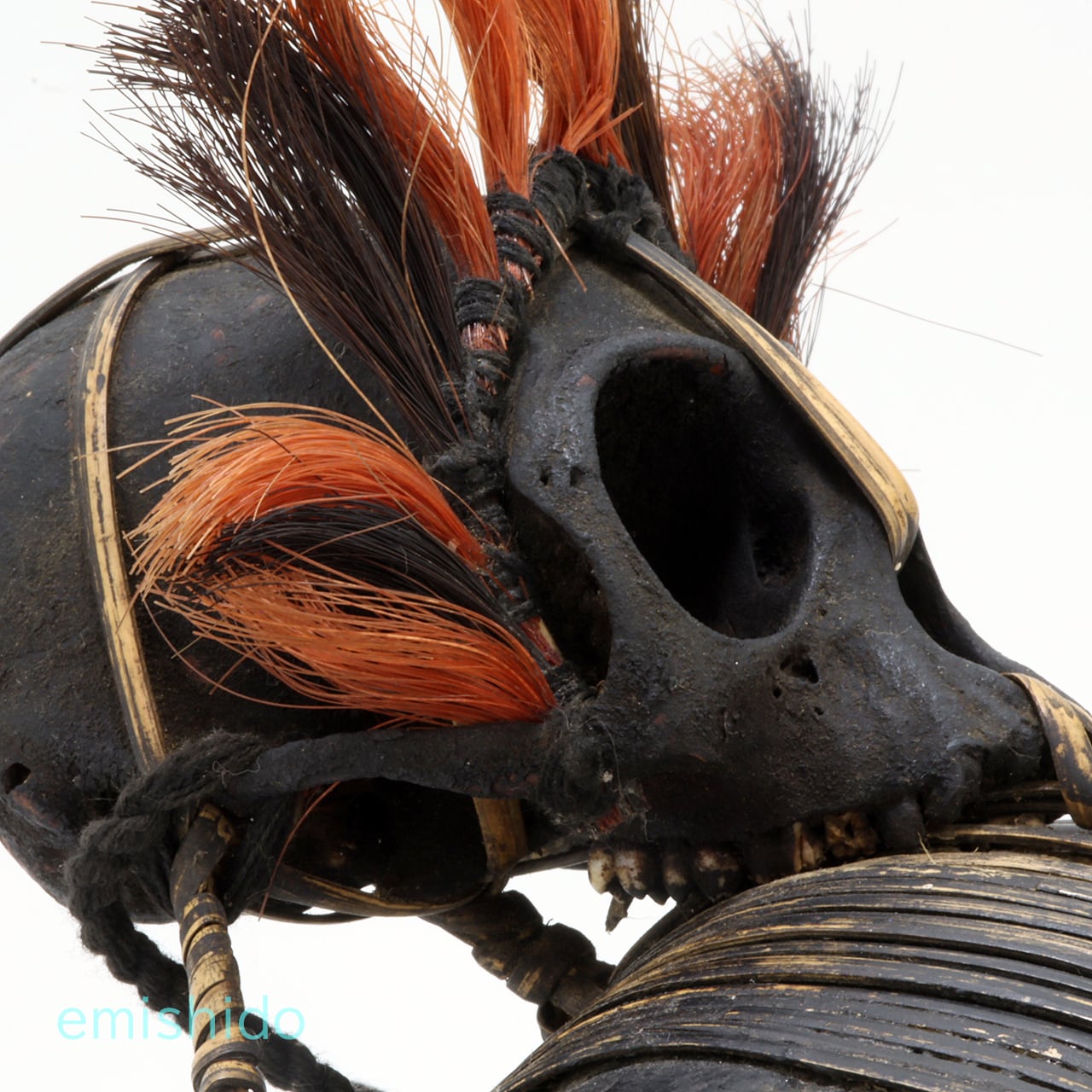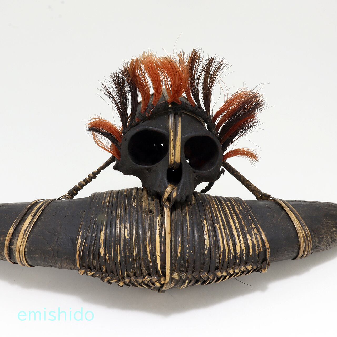 これも強烈なインパクトがあります。大きな牛の角の上に、黒く煤けた猿の頭蓋骨がのっている。頭の周りには赤と黒に染められた山羊の毛が逆立って添えられて、とてもおしゃれに決まっています。