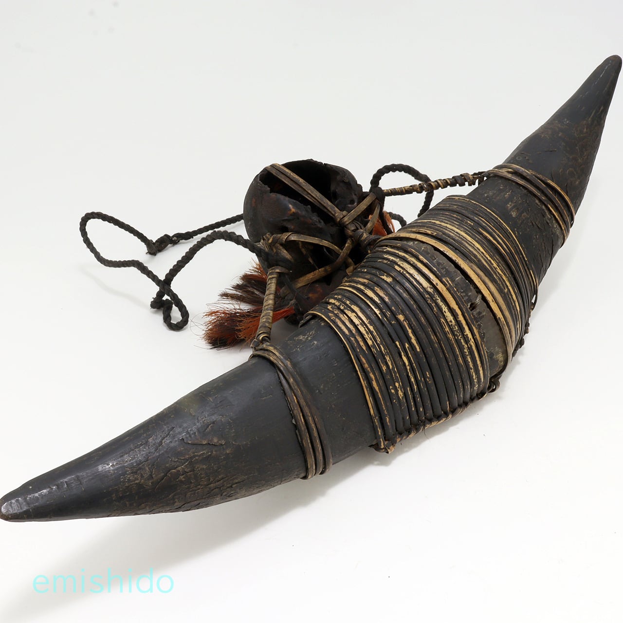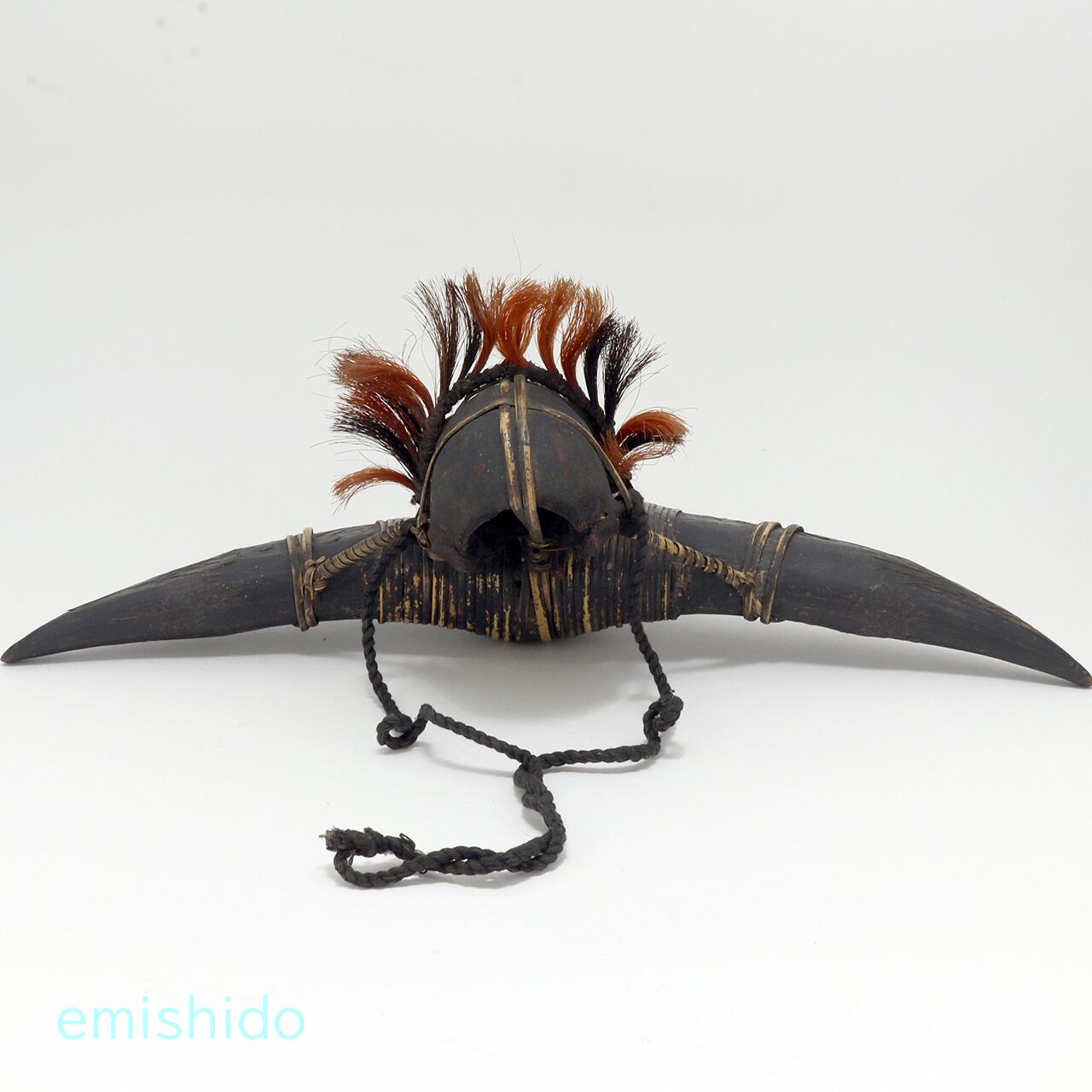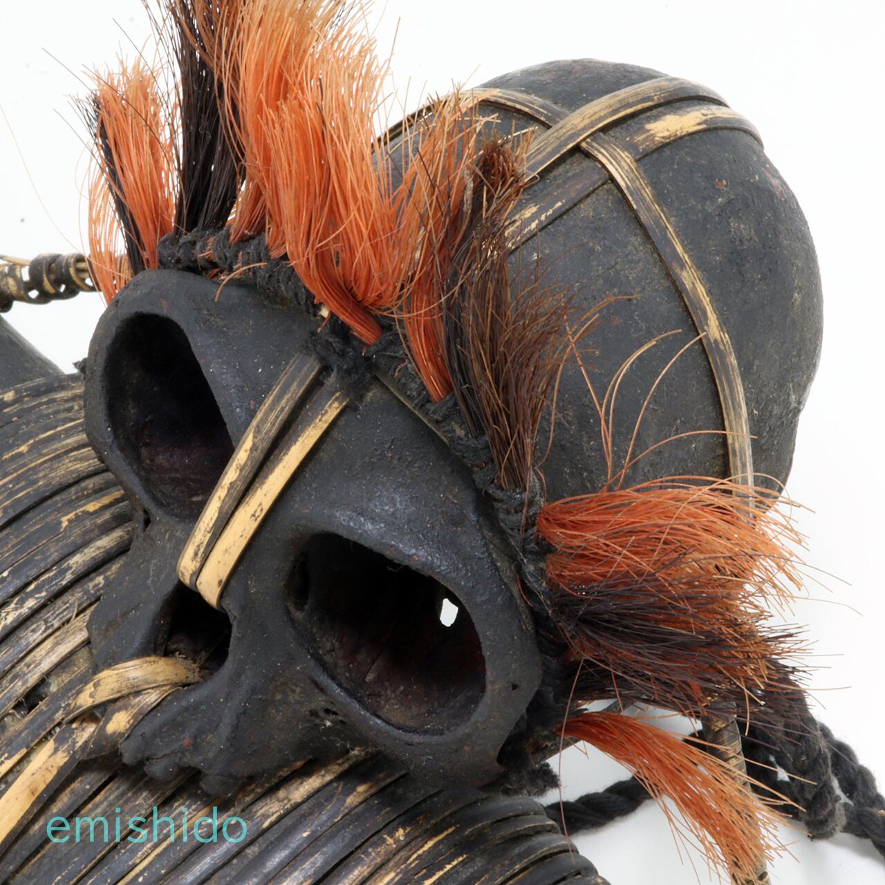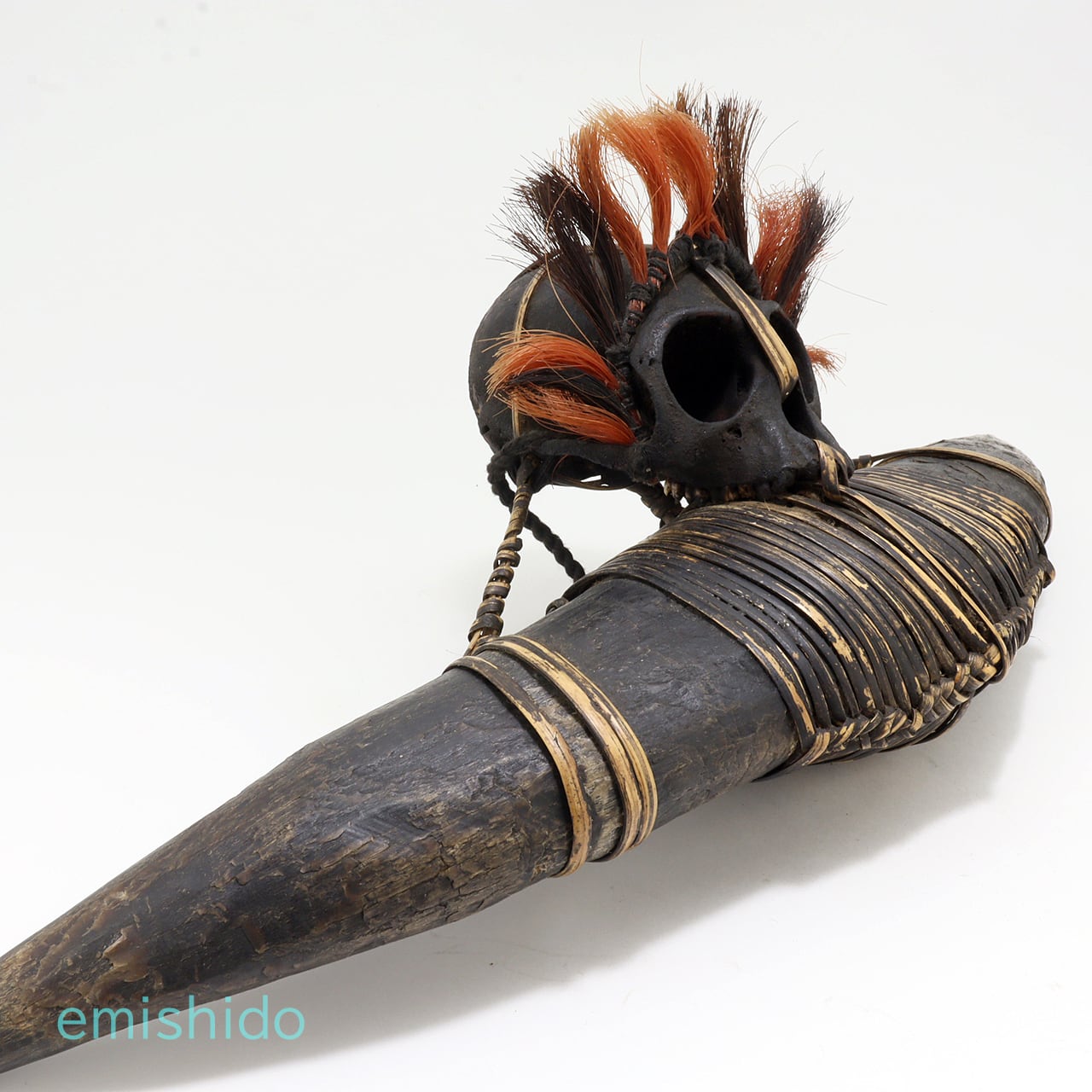 これも強烈なインパクトがあります。大きな牛の角の上に、黒く煤けた猿の頭蓋骨がのっている。頭の周りには赤と黒に染められた山羊の毛が逆立って添えられて、とてもおしゃれに決まっています。