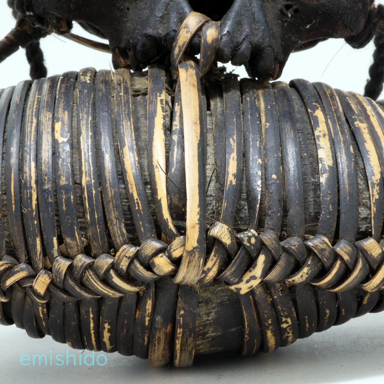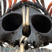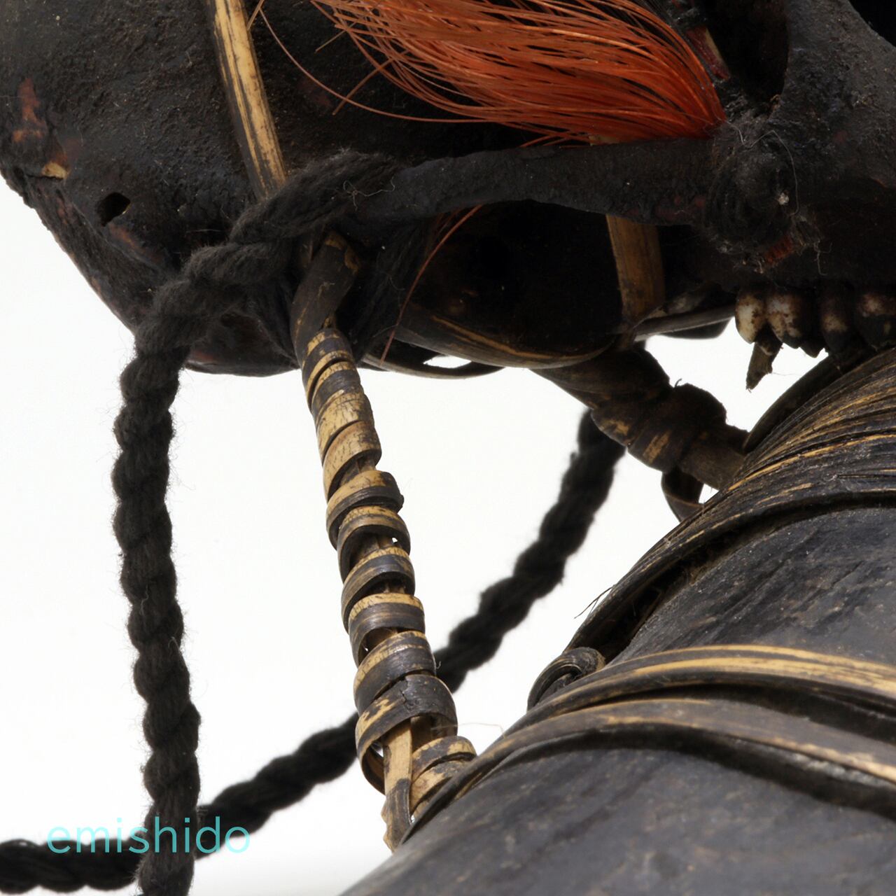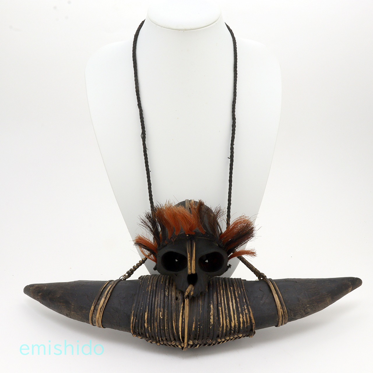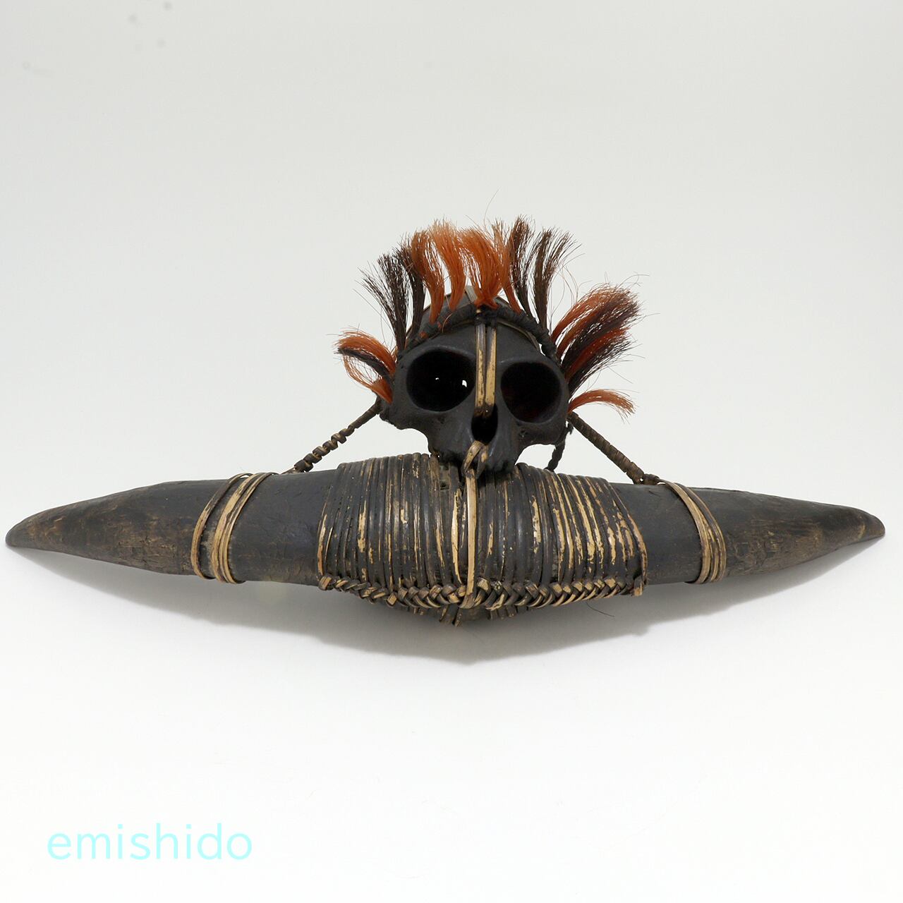 これも強烈なインパクトがあります。大きな牛の角の上に、黒く煤けた猿の頭蓋骨がのっている。頭の周りには赤と黒に染められた山羊の毛が逆立って添えられて、とてもおしゃれに決まっています。