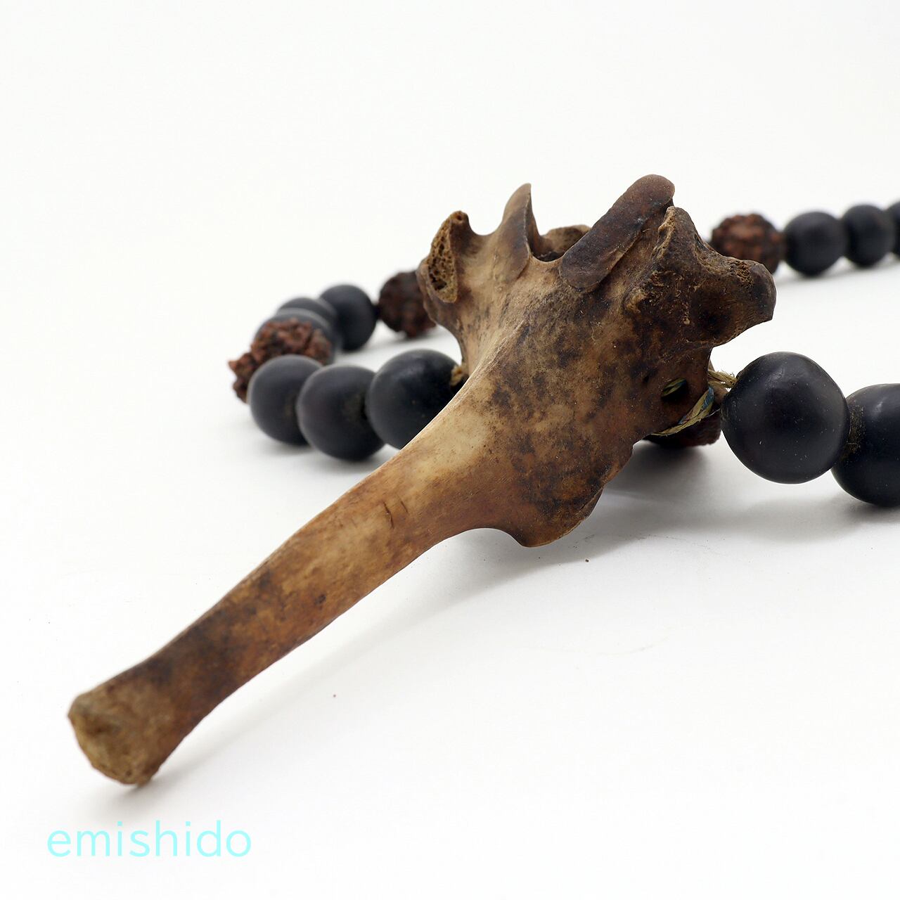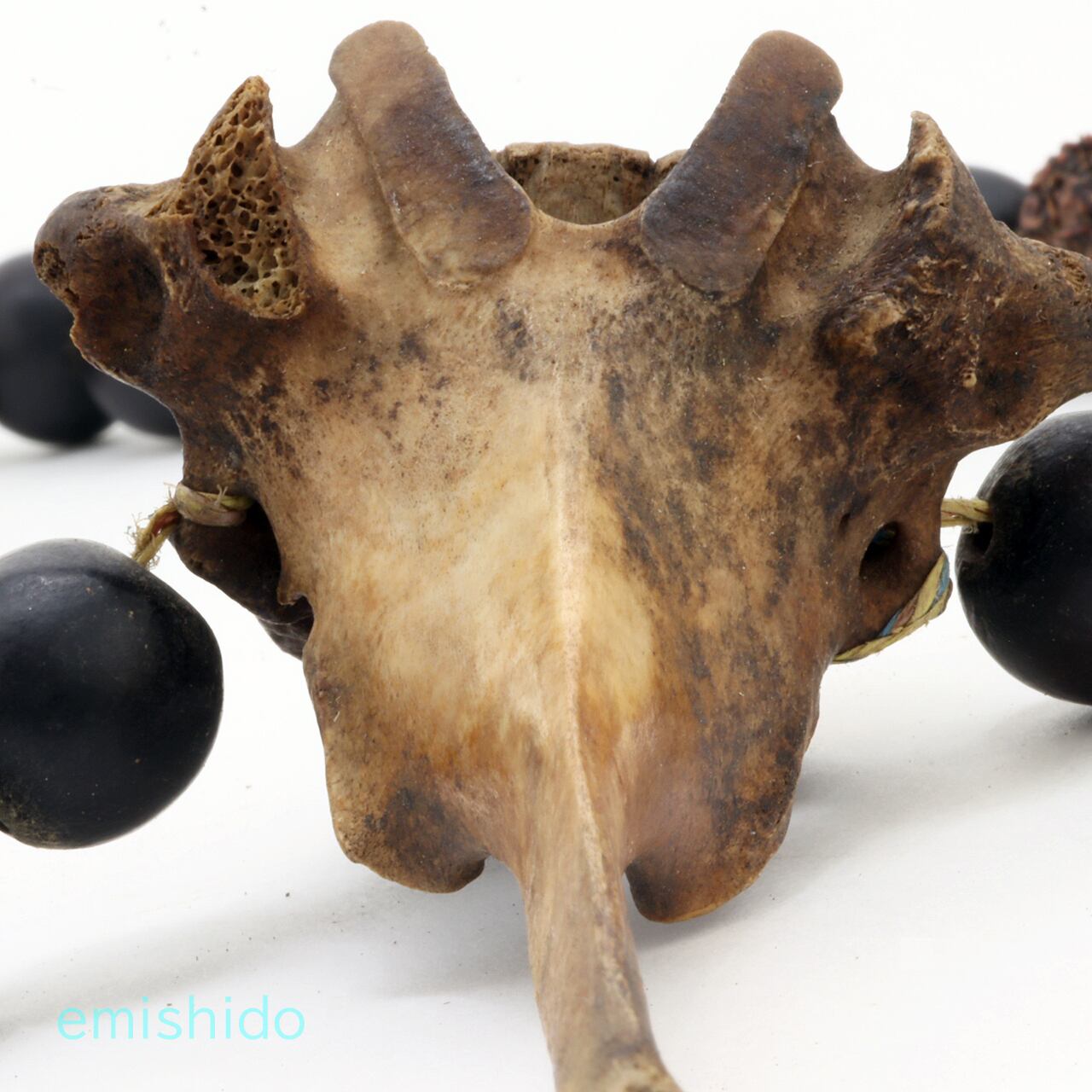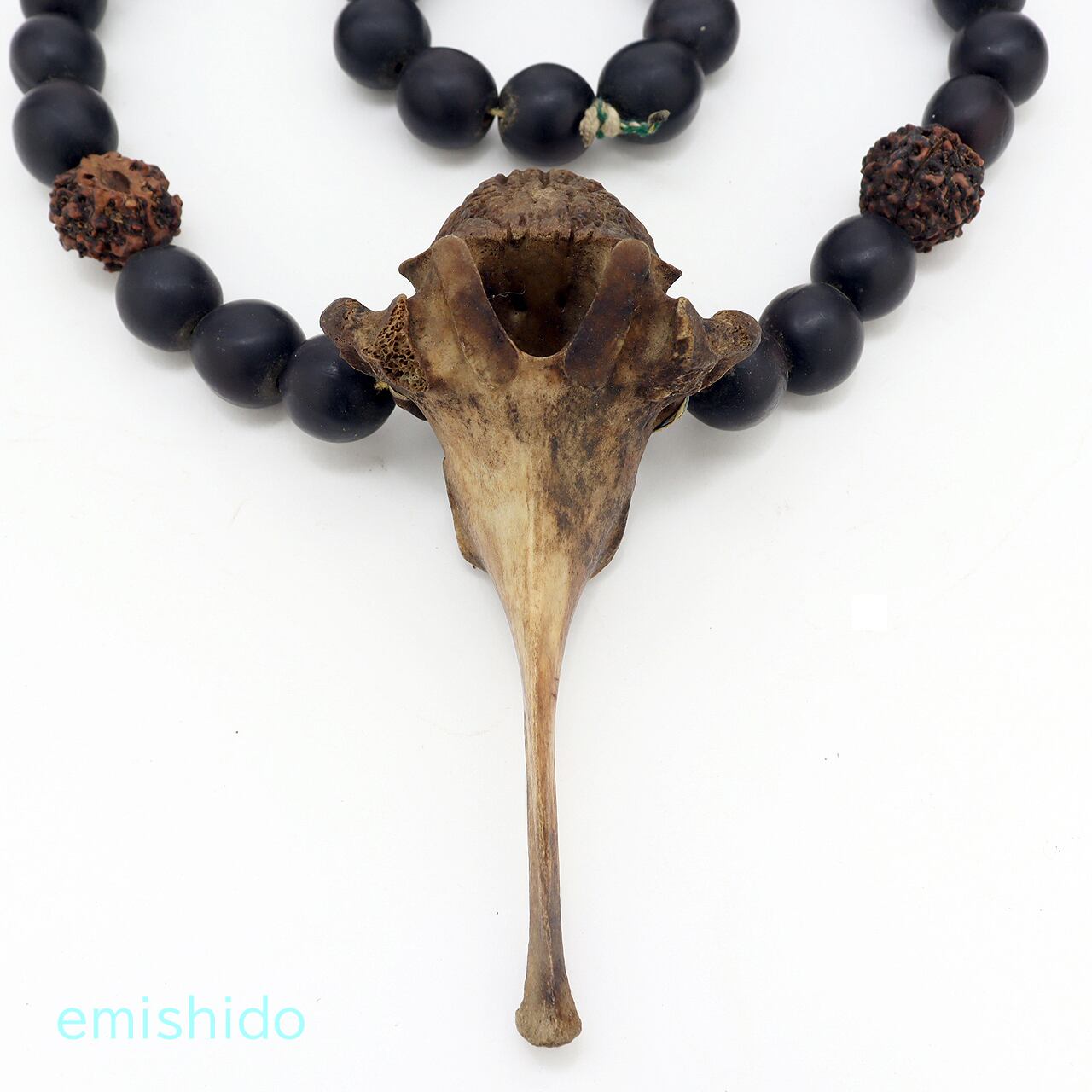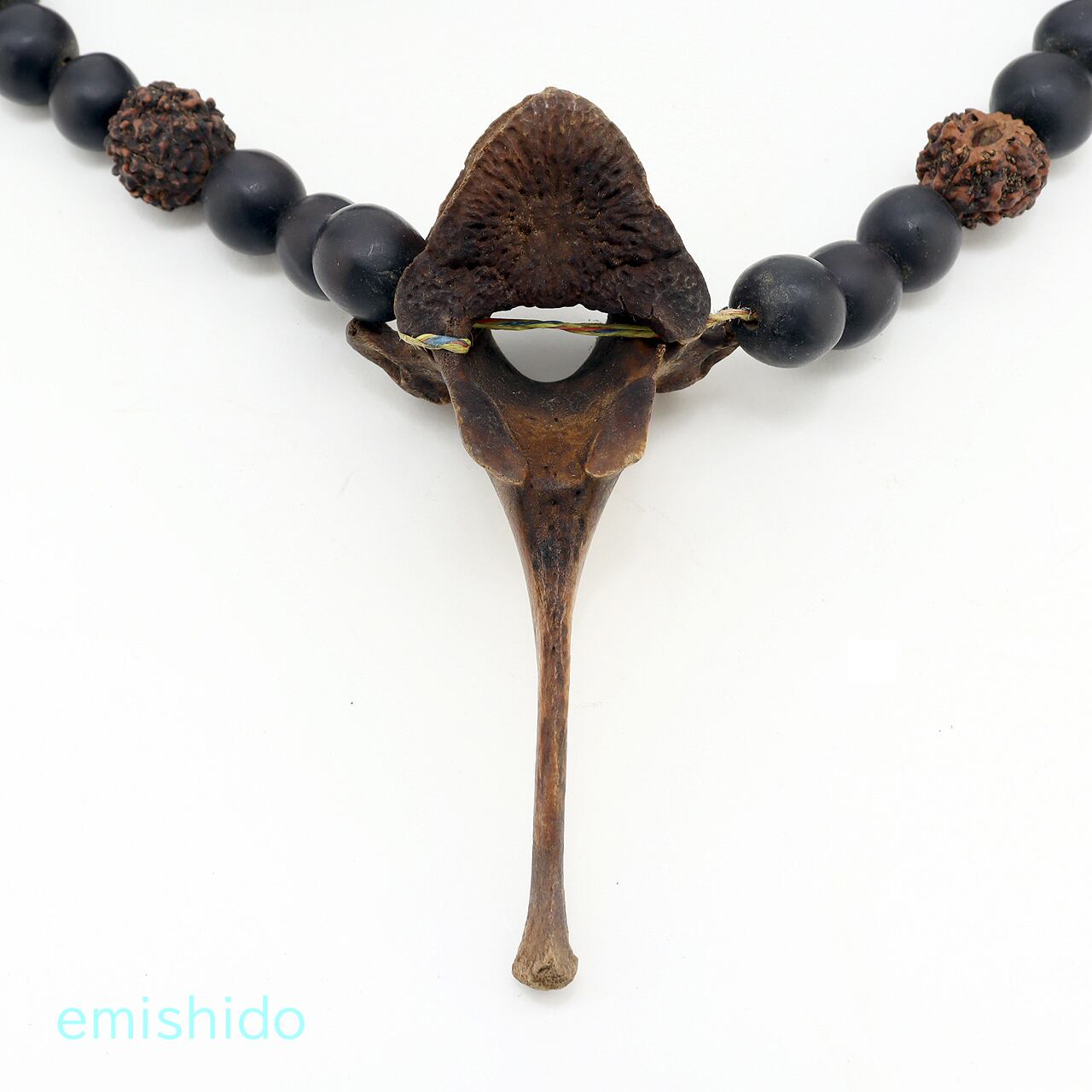 これは多分ミタン牛の関節部分の骨だと思うのですが、うまい具合に眼のようにみえる箇所があり、長く尖った骨はくちばしのように見えます。それは彼らの特別な存在である「サイチョウ」と見立てているのだと思われます。事実この骨の部位を使ったペンダントヘッド多いです。
