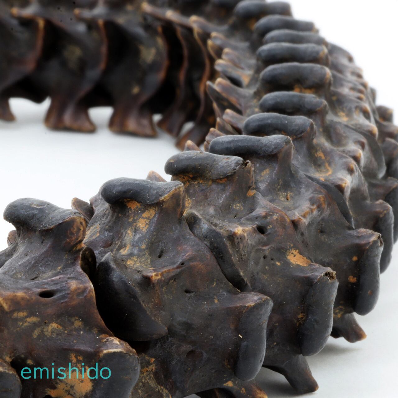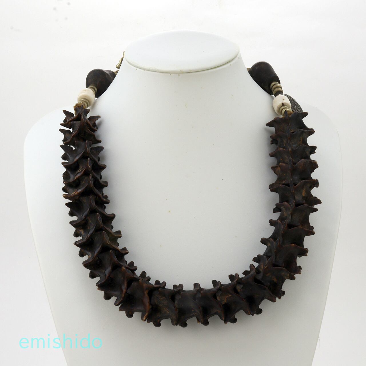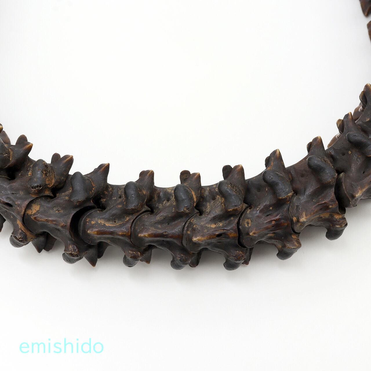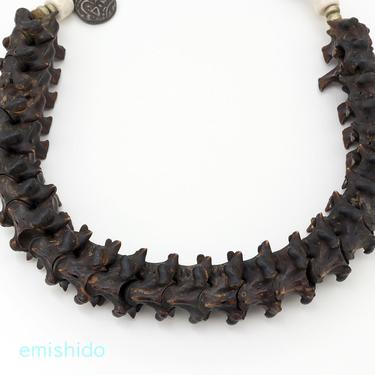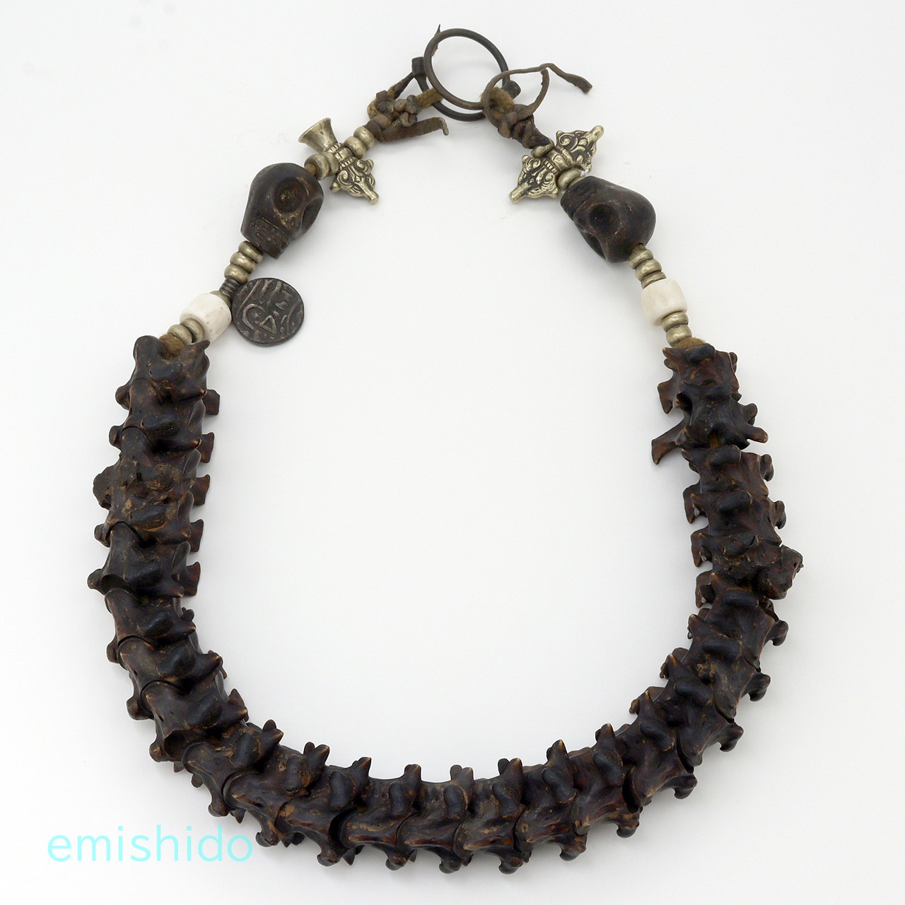 そんなカトマンズの骨董屋さんで遭遇したのが、このネックレスです。オリジナルのそのままの古いモノではないですが、心を鷲掴みにされてしまいました。時代モノだけが持つ黒光りした極太の蛇骨が素晴らしいです。太いところで32mmもあり、蛇骨特有のギザギザの連なりは存在感バツグン。