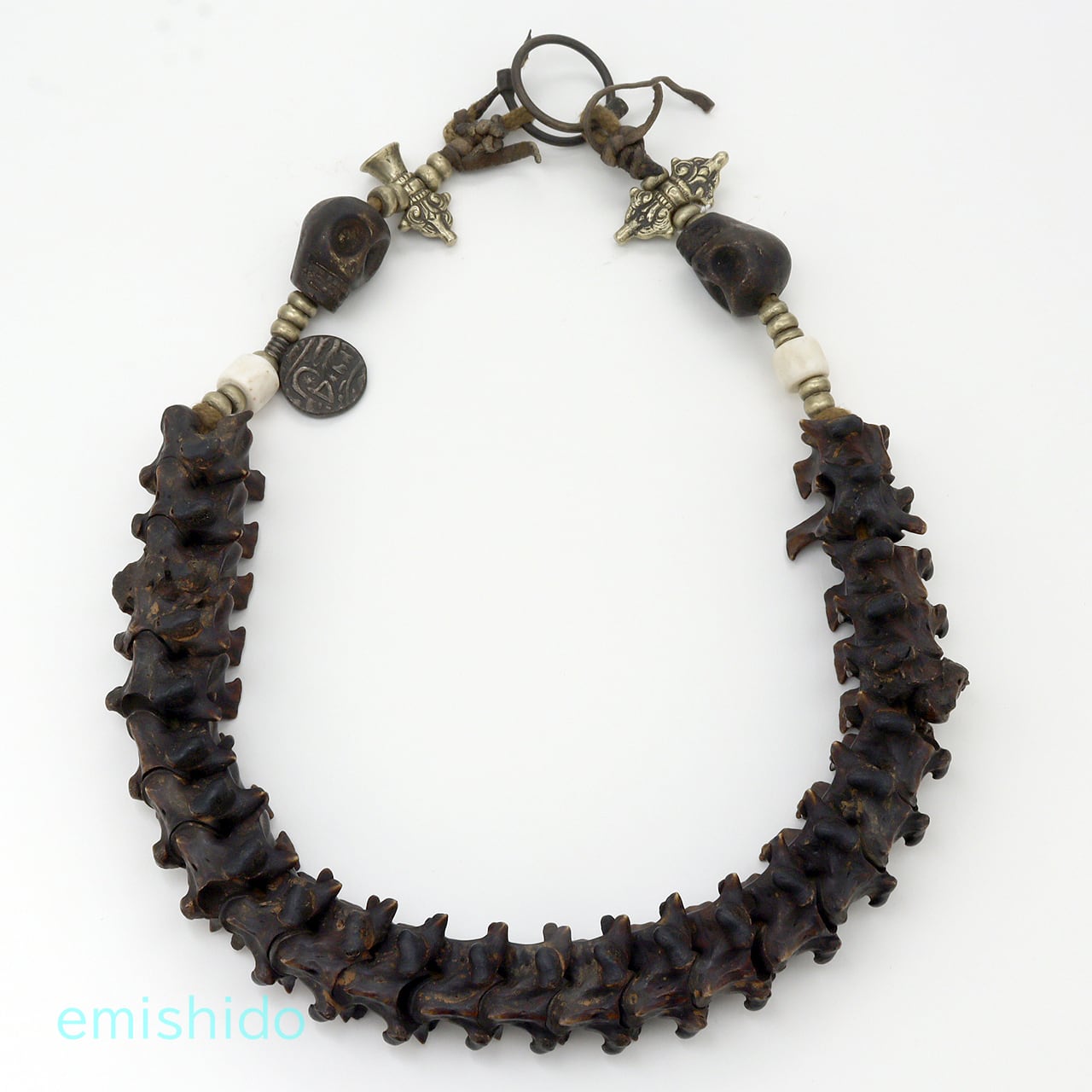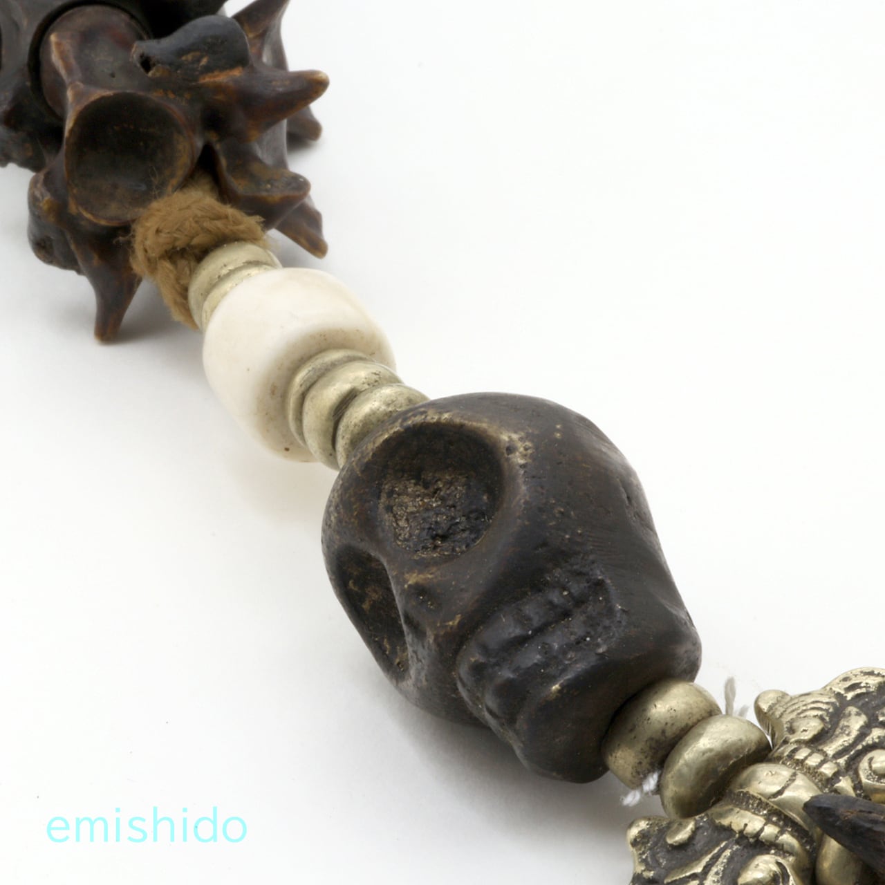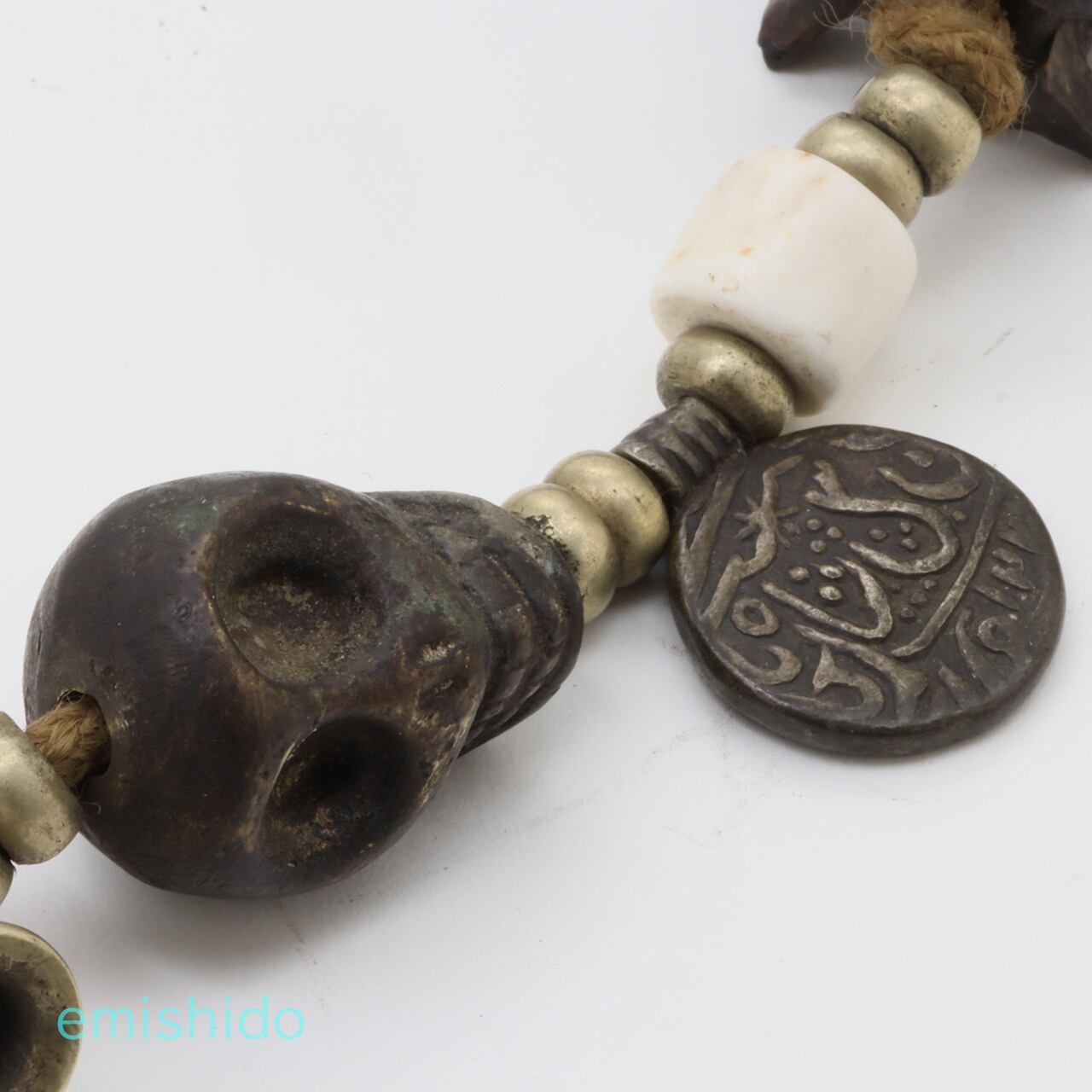 極太蛇骨だけで仕上げてしまいそうなところを、白のシェルビーズを挟んで黒のボーンのスカルビーズを配置。それが肩口から後ろに見えなくなる所に、モノクロのアクセントとなっていて憎いです。そしてネックレスのシメはバジュラ!(金剛杵。チベット語でドルジェ)これが、ともすれば、いかがわしい雰囲気からグッと奥深い知的な印象を、さりげなく加味。サビとしてシンメトリーを壊す「ムガールコイン」も効いてる。