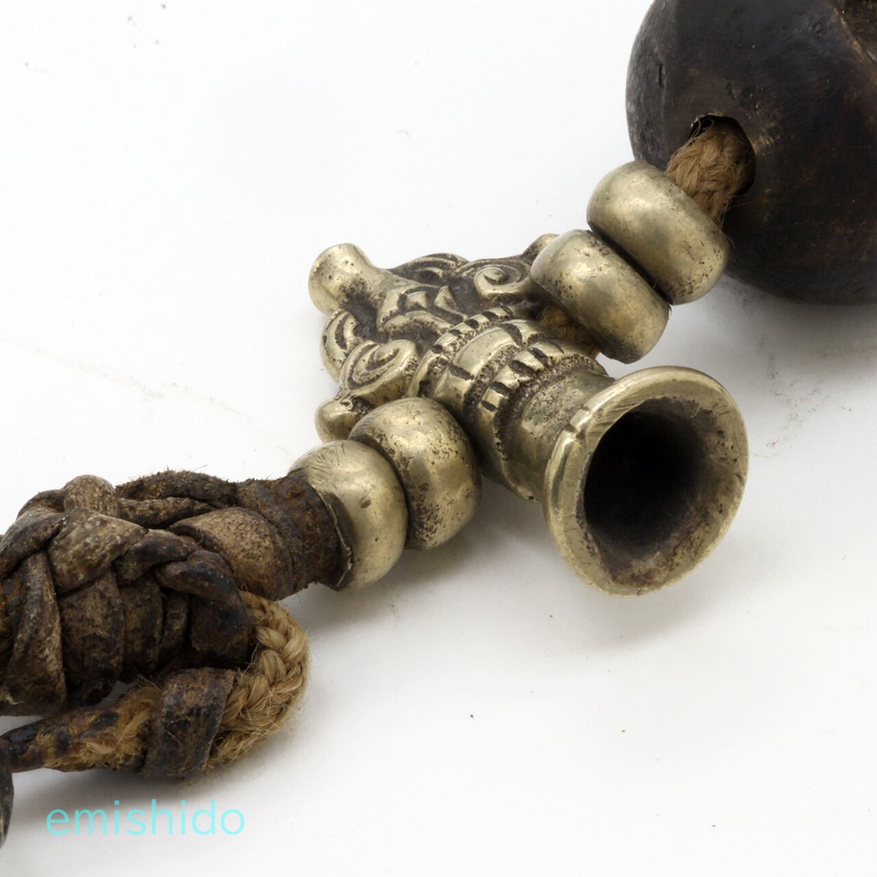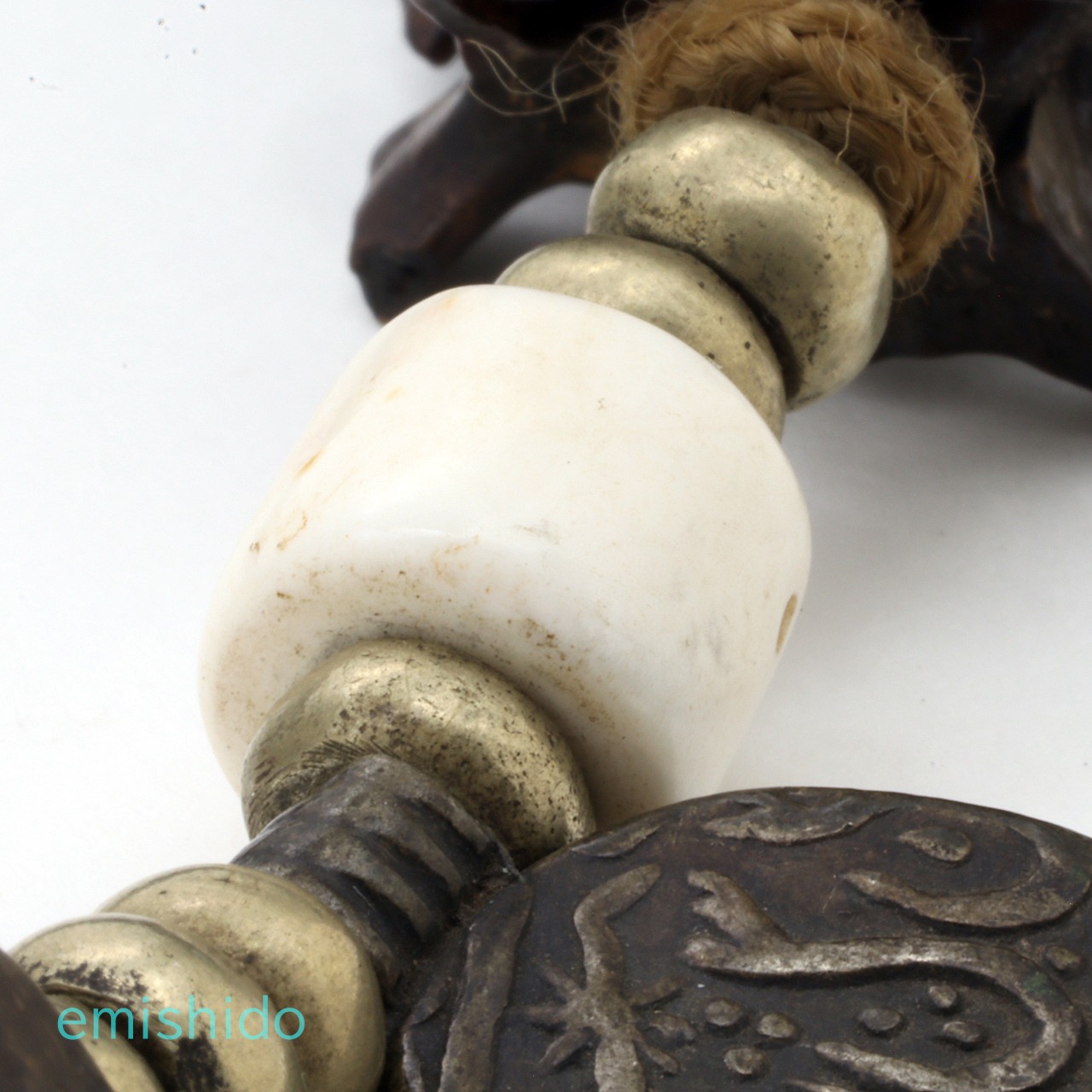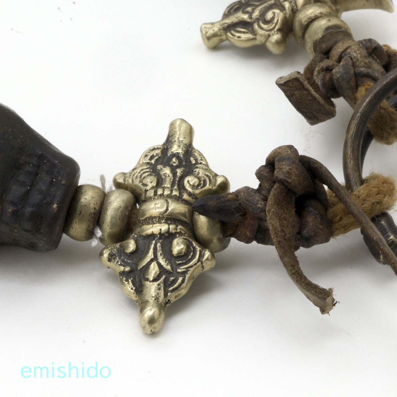 極太蛇骨だけで仕上げてしまいそうなところを、白のシェルビーズを挟んで黒のボーンのスカルビーズを配置。それが肩口から後ろに見えなくなる所に、モノクロのアクセントとなっていて憎いです。そしてネックレスのシメはバジュラ!(金剛杵。チベット語でドルジェ)これが、ともすれば、いかがわしい雰囲気からグッと奥深い知的な印象を、さりげなく加味。サビとしてシンメトリーを壊す「ムガールコイン」も効いてる。
