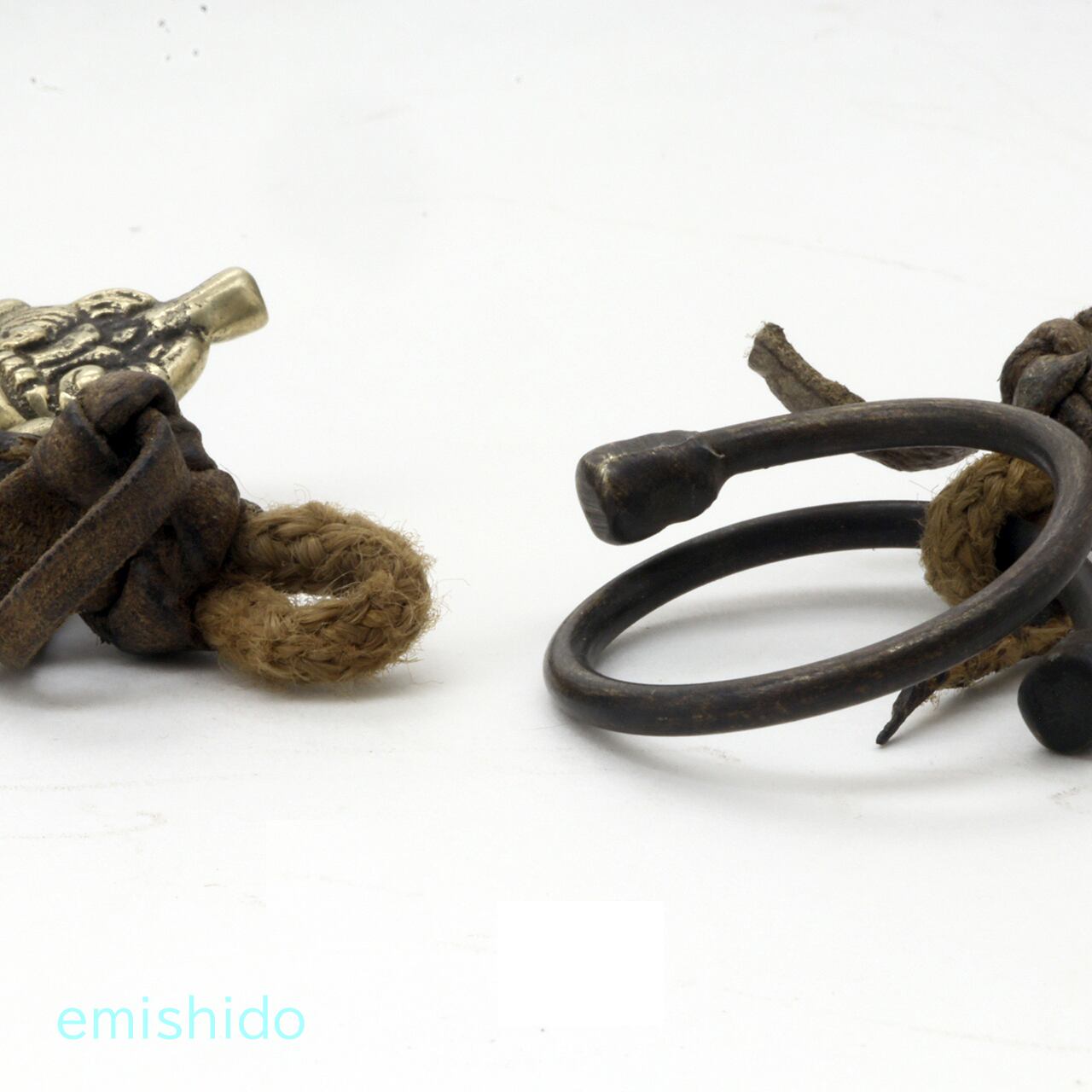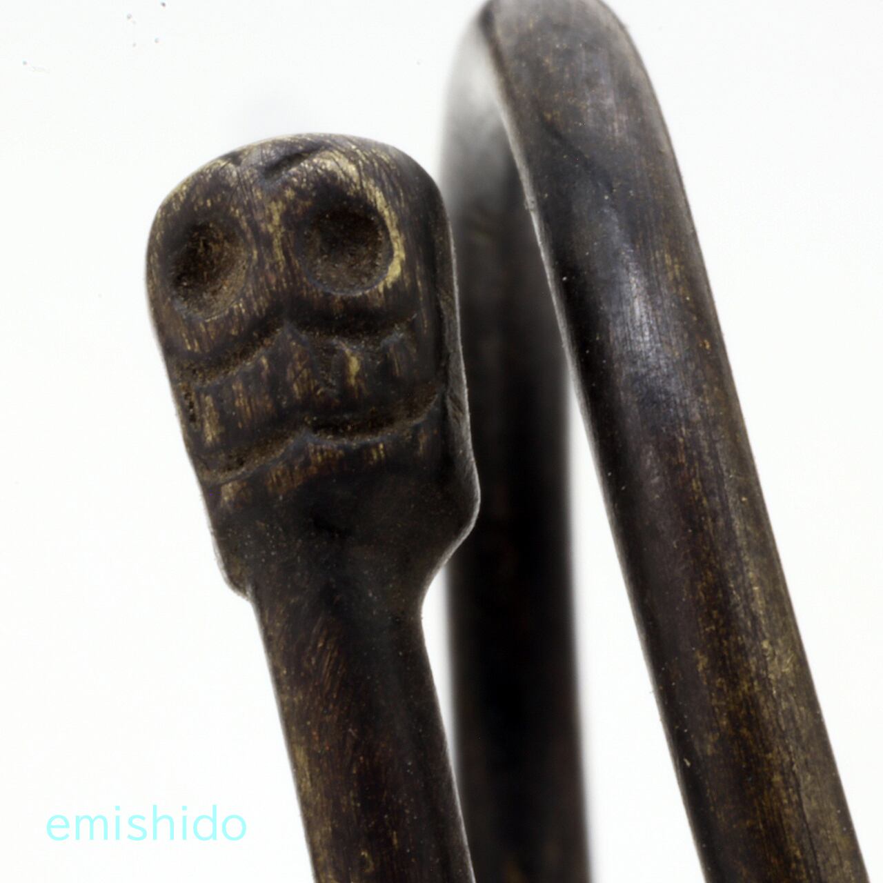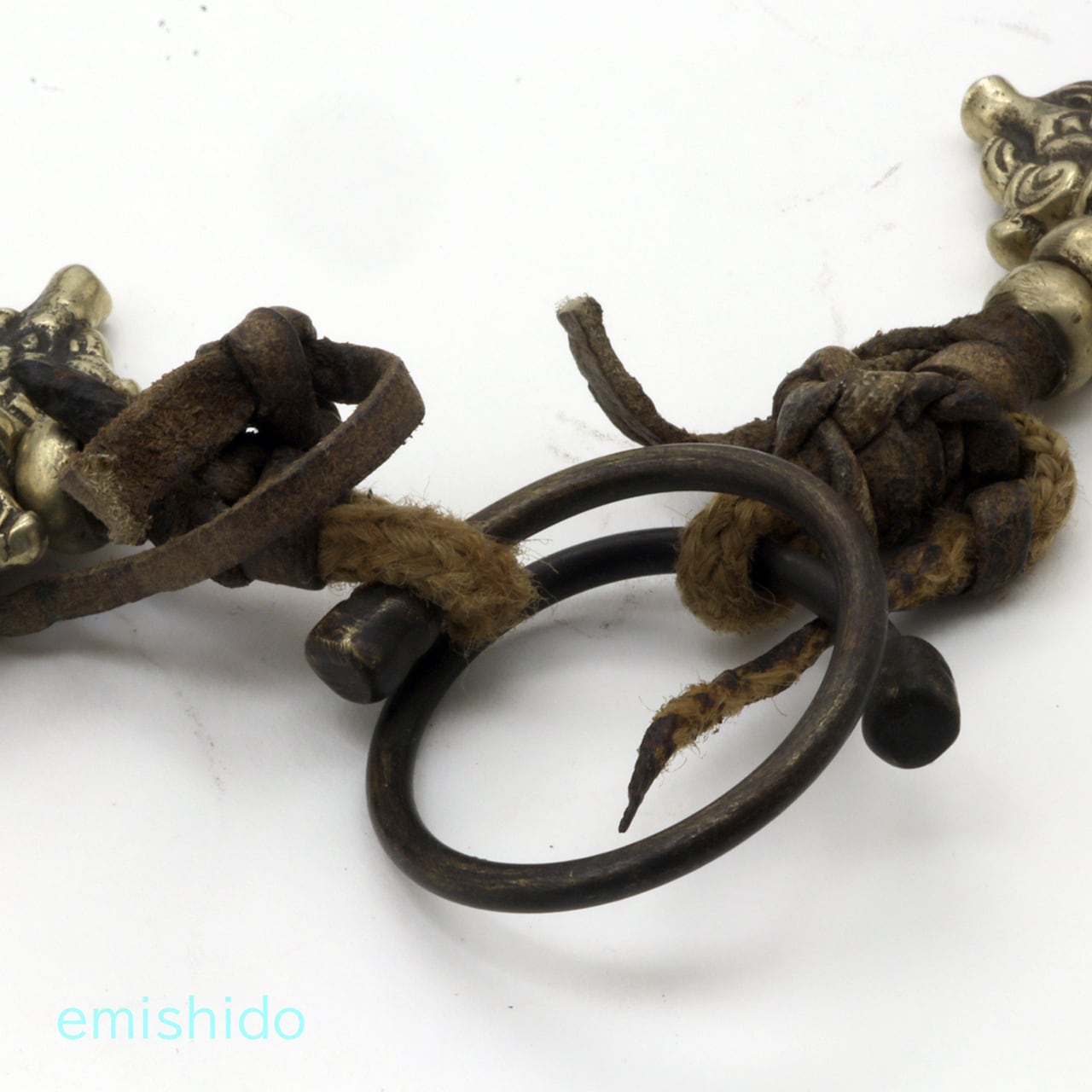 ネックレスの留め具部分にも注目。このようなタイプは初めて見ました。ネックレスはやはり紐がいいですよね、最後の紐の留め具のやり方にこういうやり方があるんだ、と感心しました。また写真を撮っている時に気がついたのですが、紐のワッカが抜けにくいようにコイル状に巻いた金具の先端に、ダメ押し的に小さなスカルがある。泣けますね。