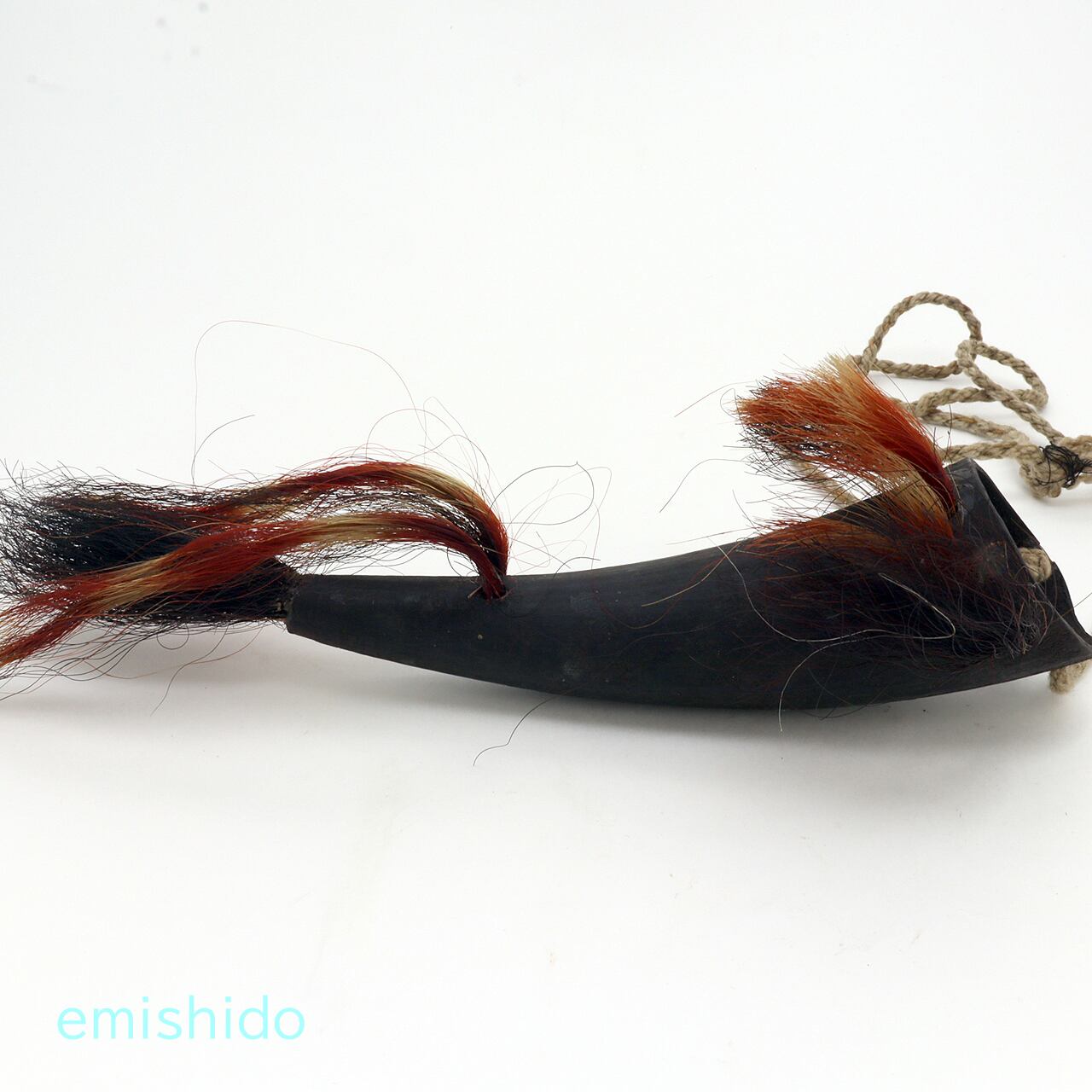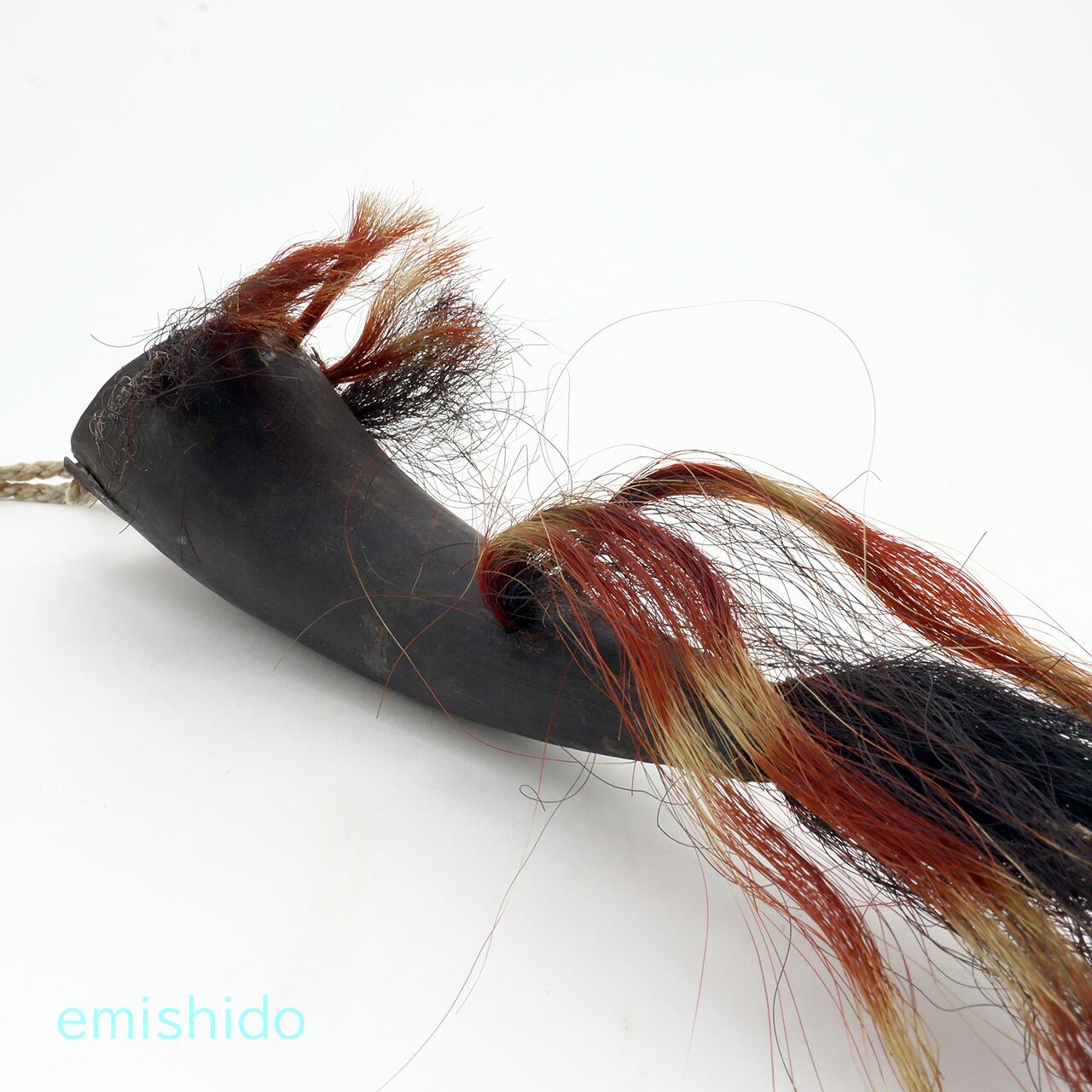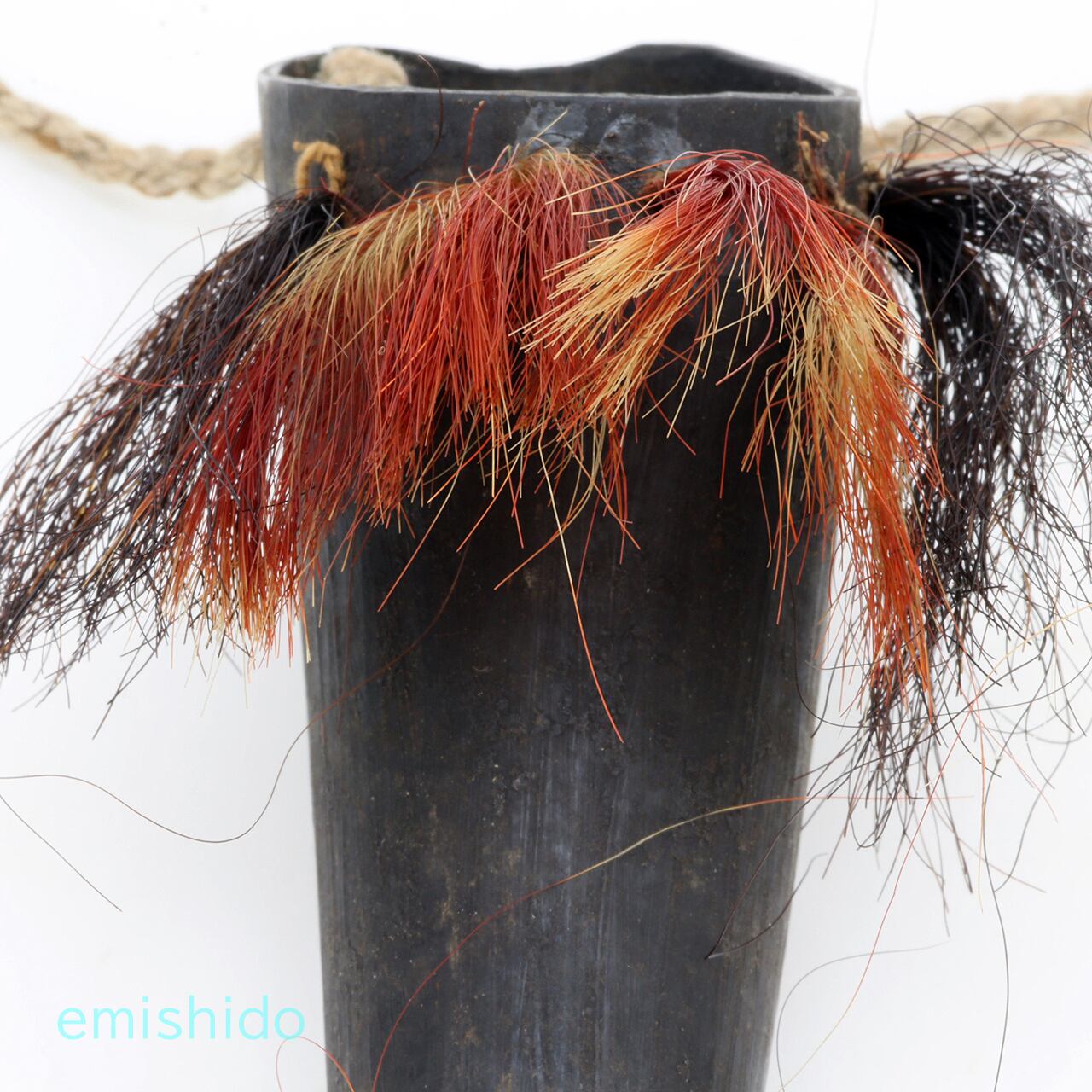 このような赤と黄色(または赤と黒)に染めたヤギの毛を使った飾りは、ナガ族の装飾のひとつの定型になっているようです。30cm以上ある角に毛を埋め込んだ腰飾りなどがあります。これはカゴの飾りで使われていたパーツをネックレスにして使っていたと思われます。