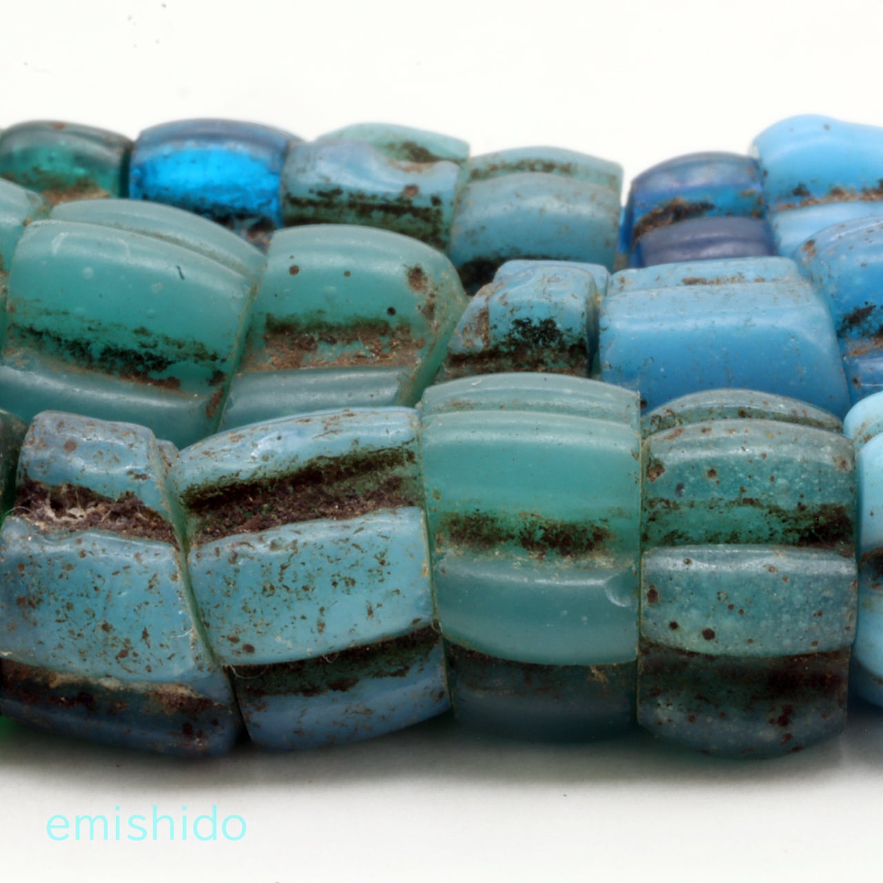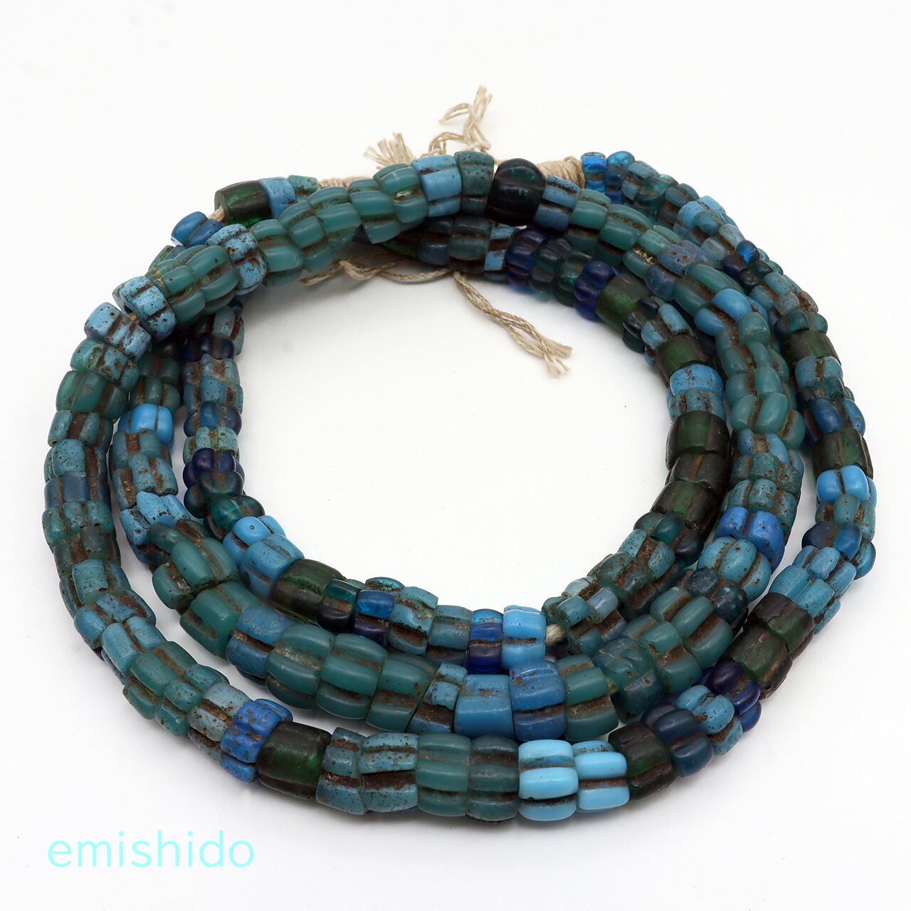 水色から青、紺色のグラデーションカラーが美しい「ミカン玉」とか「メロンビーズ」とも呼ばれる一連のネックレスです。ナガ族が使ってたミカン玉のネックレスは大体が単色のものが多く、この一連も恐らく同一色のネックレスがばらけたのを、寄せ集めて組み合わされたものだと思います。