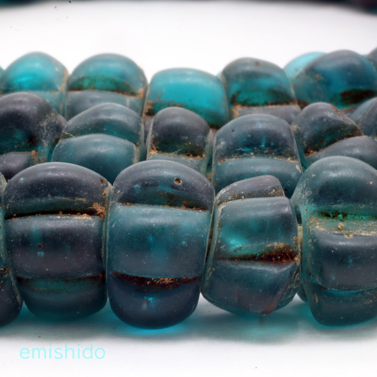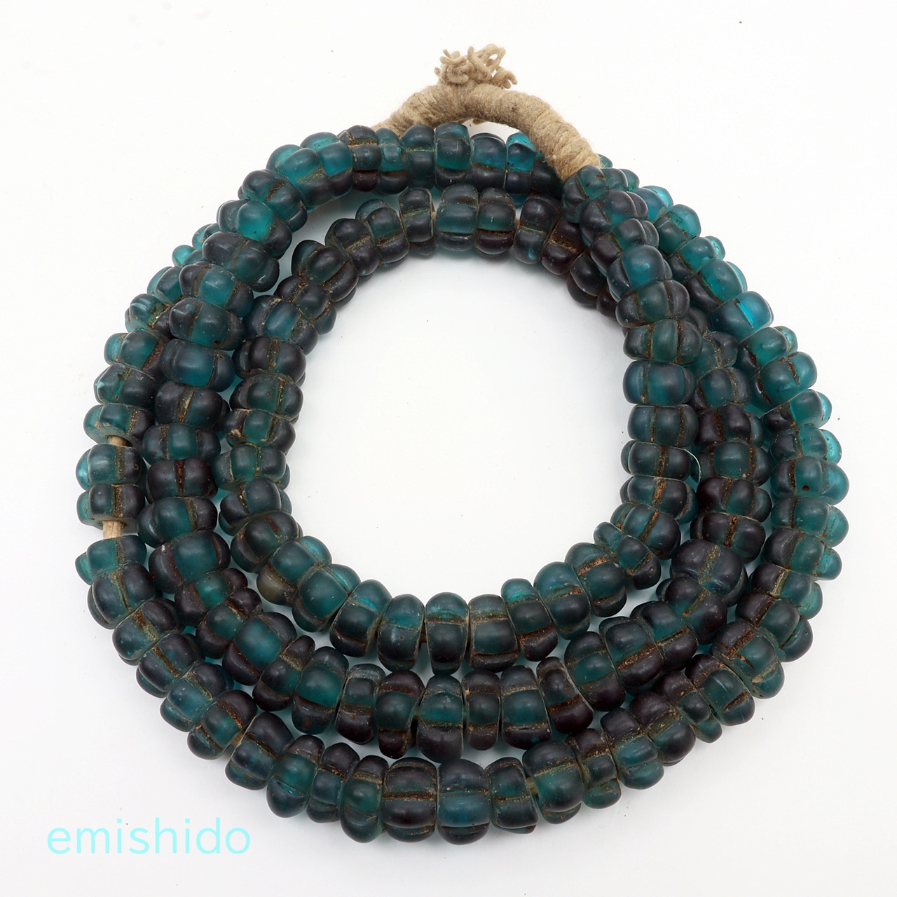「ミカン玉」とか「メロンビーズ」とも呼ばれる緑色ビーズの一連です。色の表現は難しいです。透明感がある青味がかった緑で美しいです。