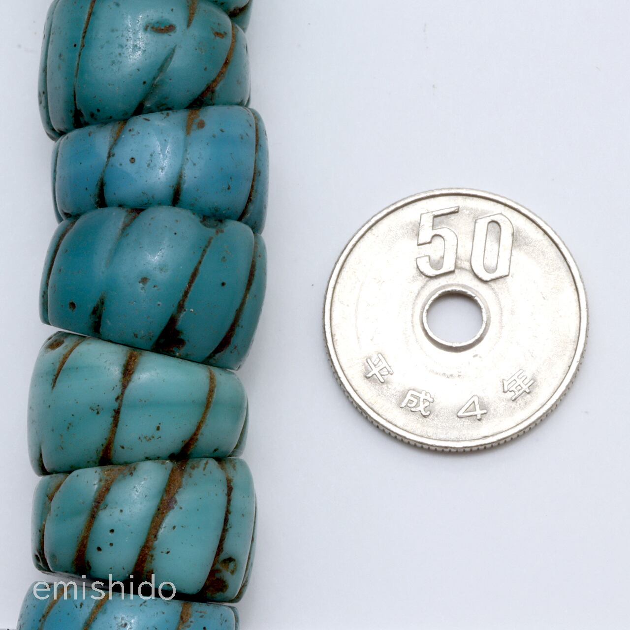 かなり大振りなミカン玉で、このサイズは珍しいです。水色系の絶妙なグラデーションが際立って美しく、ミカン玉の凸部のすり減り、辛うじて溝の線が残っているというような状態の玉です。代々受け継がれてきた歴史を感じさせてくれます。