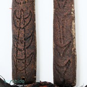 これだけが、紐のパーツが筒状のパーツではなく、骨の板状のパーツが使われ、とても素朴な絵が彫られています。分かりやすい人の顔は、ホンワカ、ホンノリしていて、「首狩り族」からくる禍々しいイメージからかけ離れていて、とても面白いです。あとはやはり「ミタン牛( Mithun )」のシンボル。