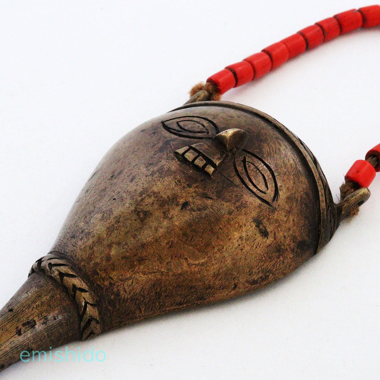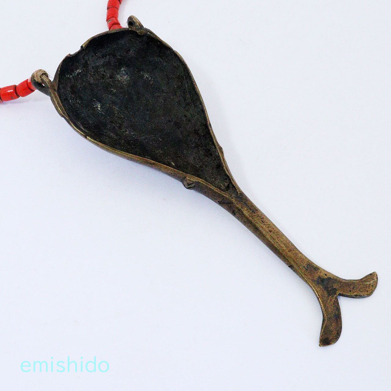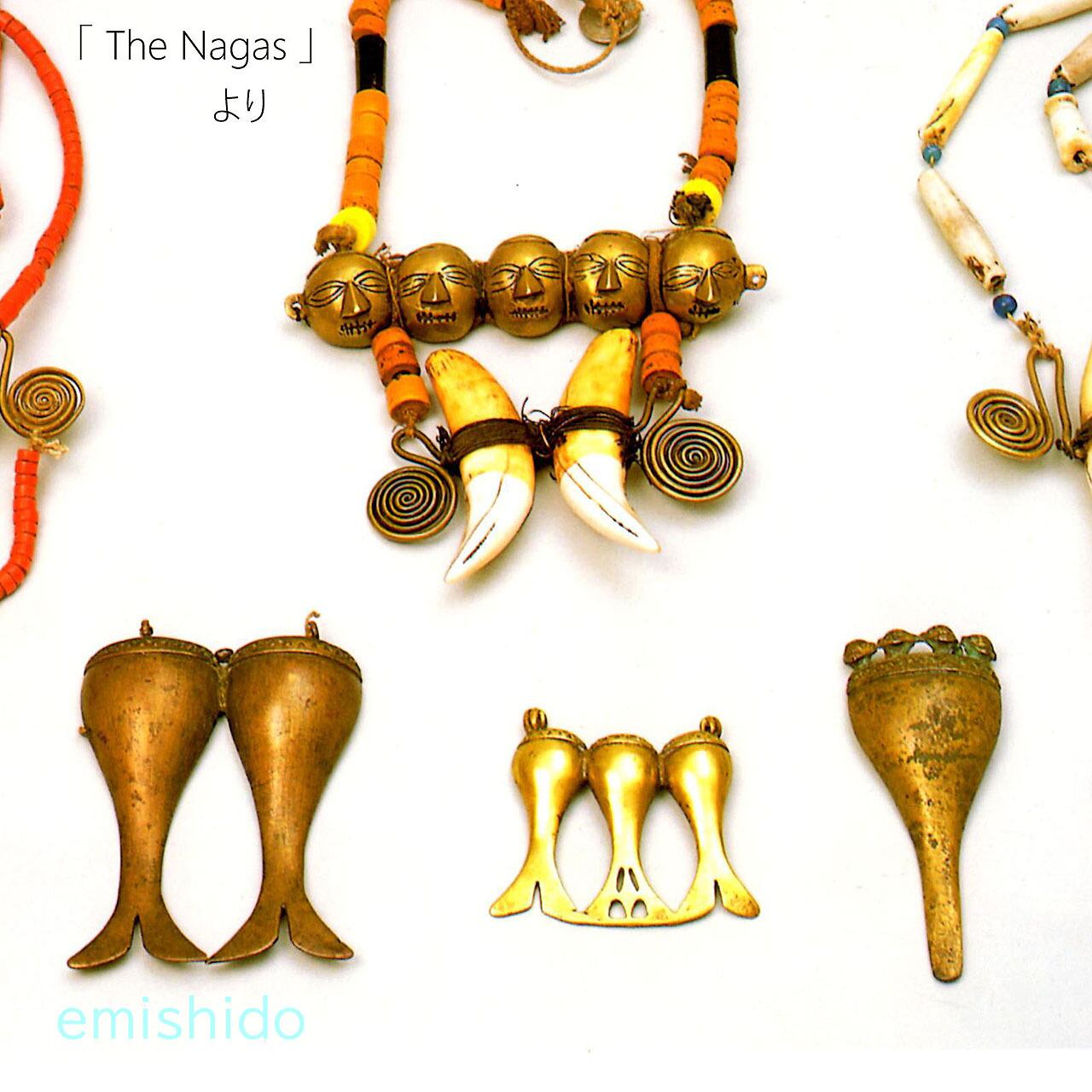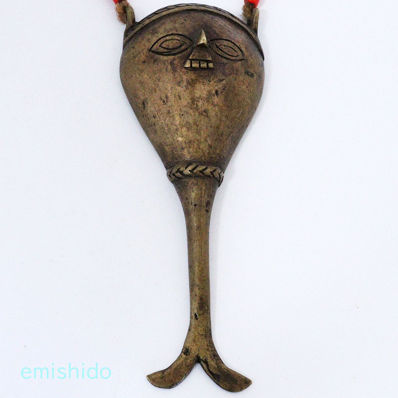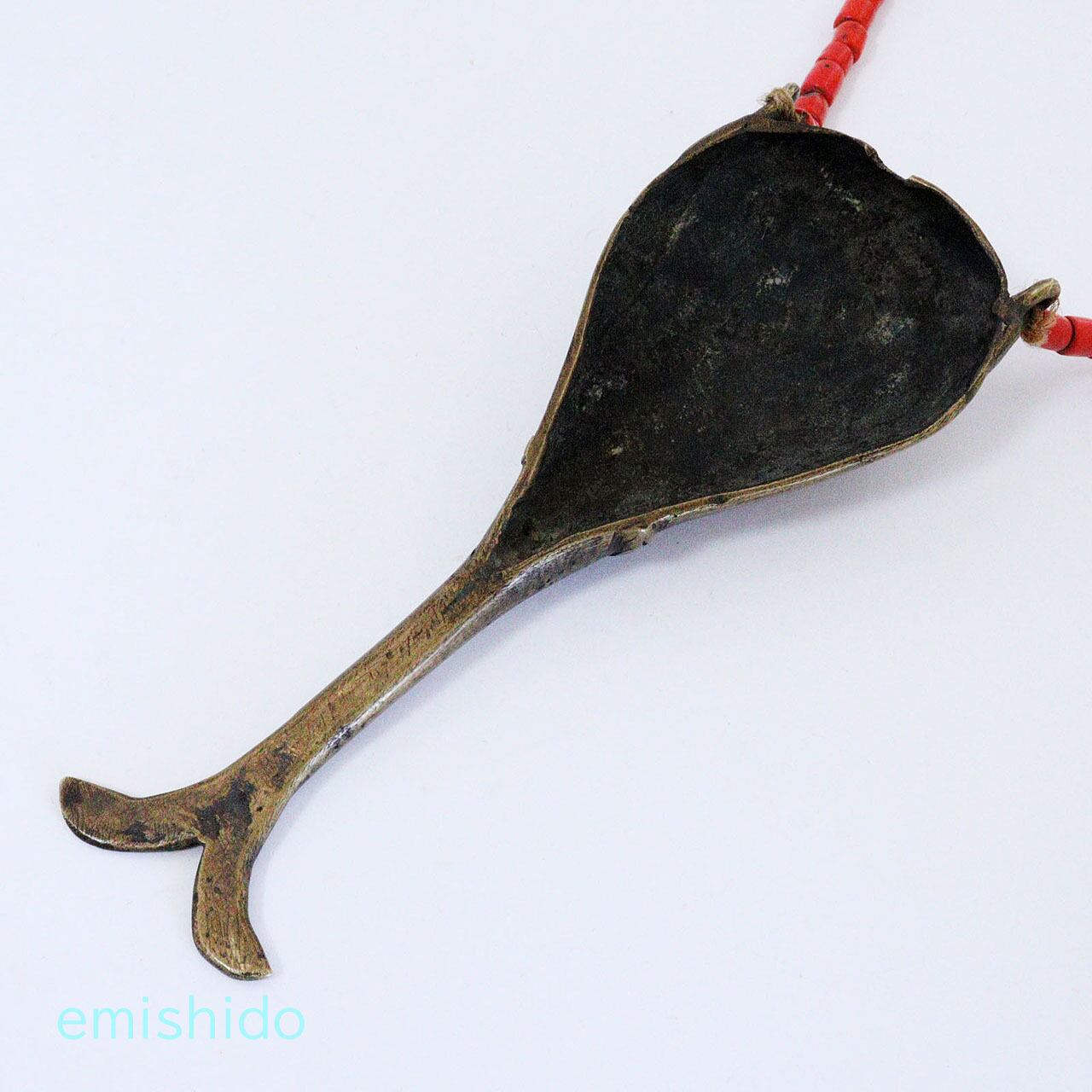 ナガ族の真鍮製のペンダントで人の顔と並んで、代表的なデザインの「フィッシュテール」と呼ばれているネックレスです。本来は首狩りをした者のみが許される勇者の証です。