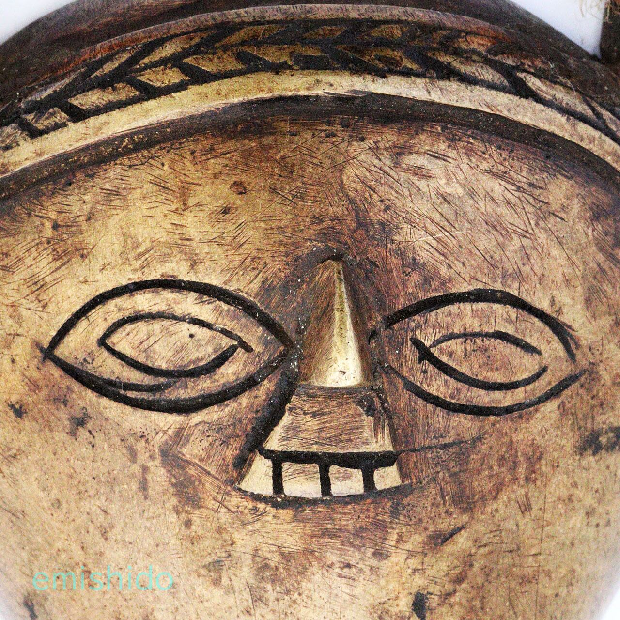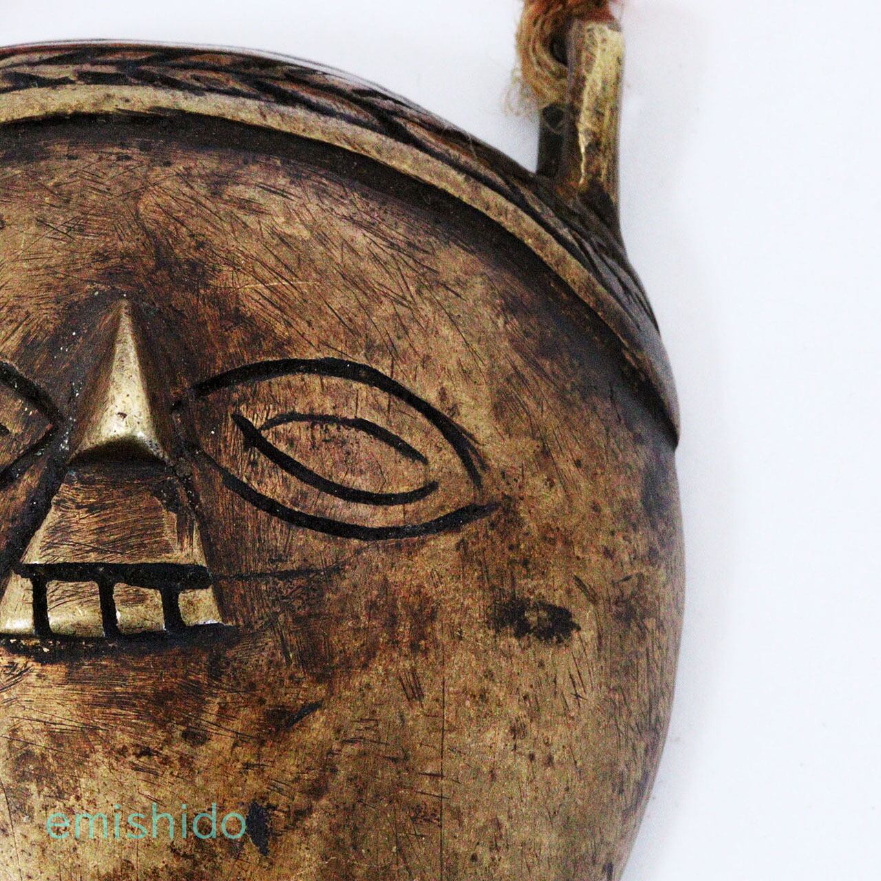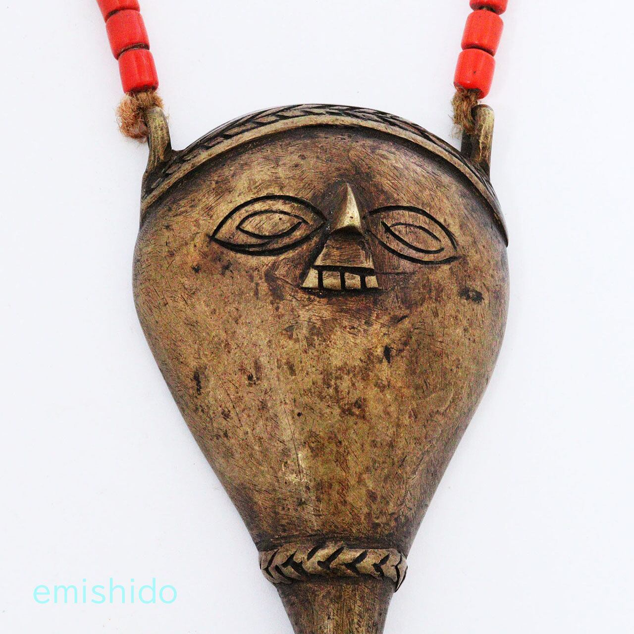 普通「フィッシュテール」には人の顔は付いていませんが、これは珍しく人の顔が付けられ、二重線の眼に三角形の鼻という顔のペンダントの特徴を用いてバランスよく作られています。