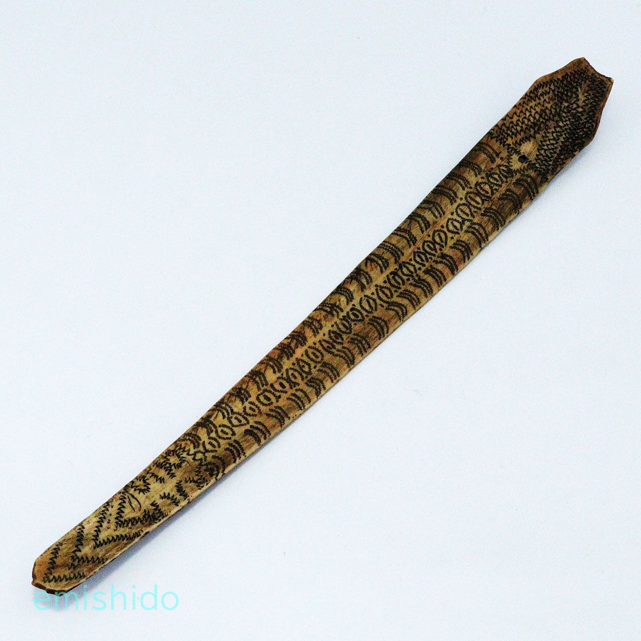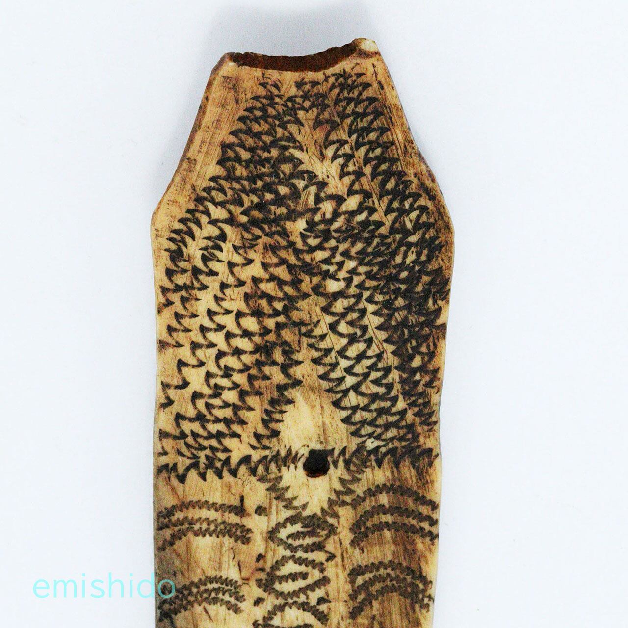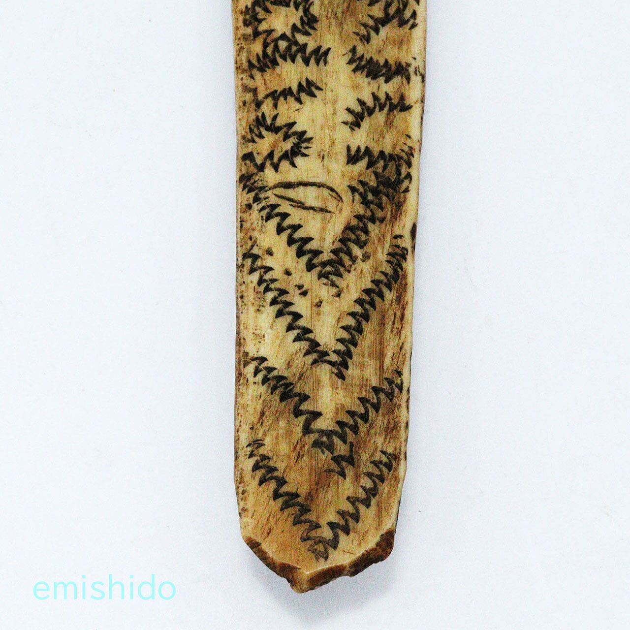 骨を薄く板状に削り、表面に細かい描線で、如何にもトライバル的な模様が描かれたヘアピンです。やったことはありませんが、骨をここまで薄く削るには大変な労力が必要であるように思います。