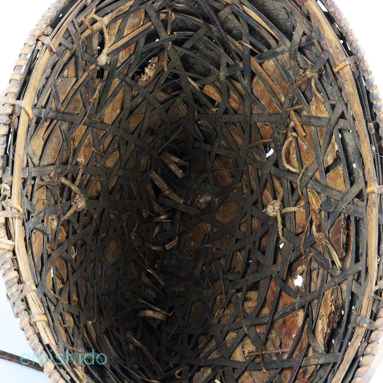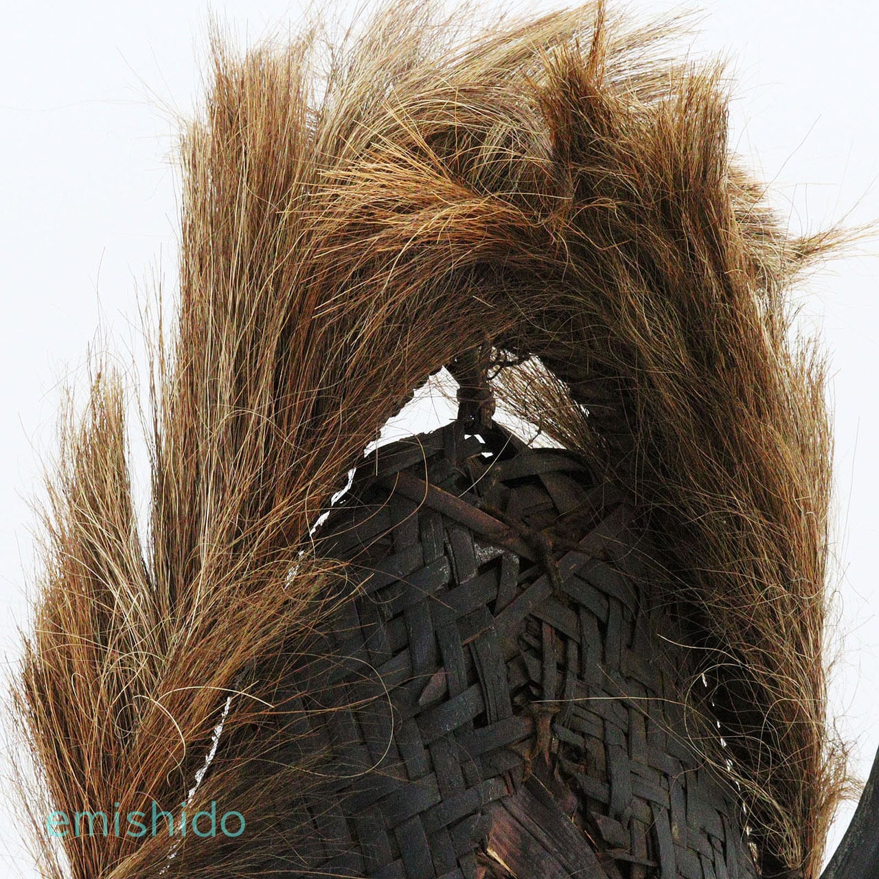 竹で編んだ帽子に、カモシカの角が生えています。モヒカン刈りのような逆立った毛はイノシシでしょうか?