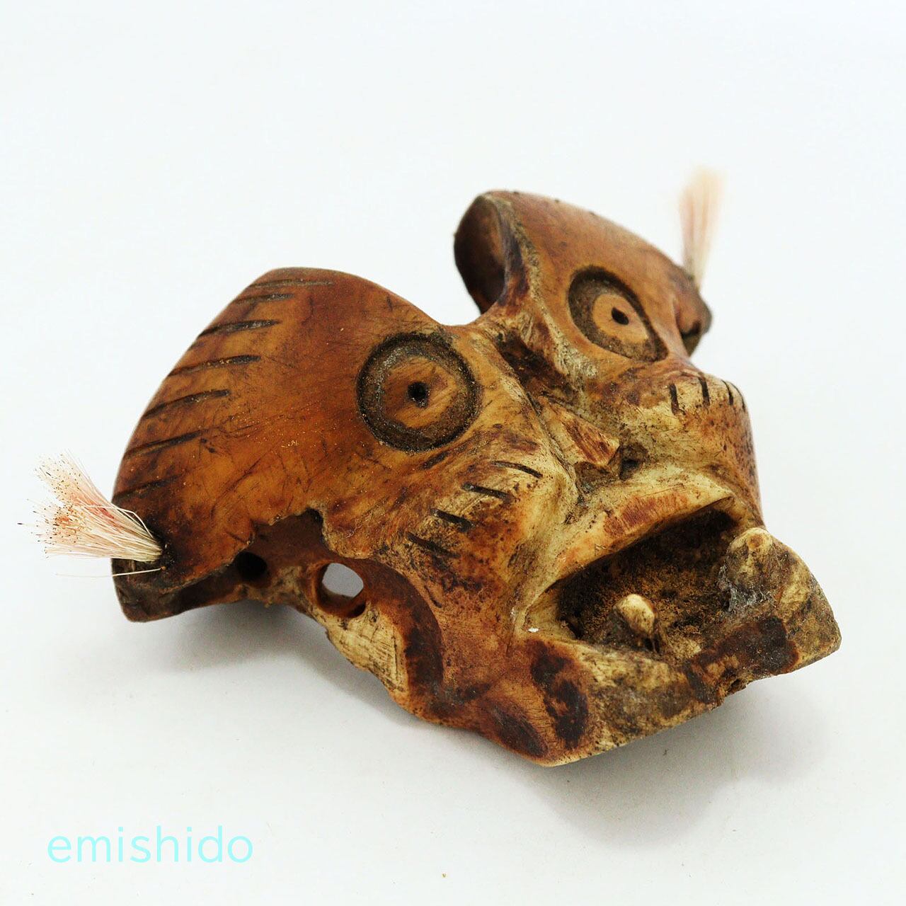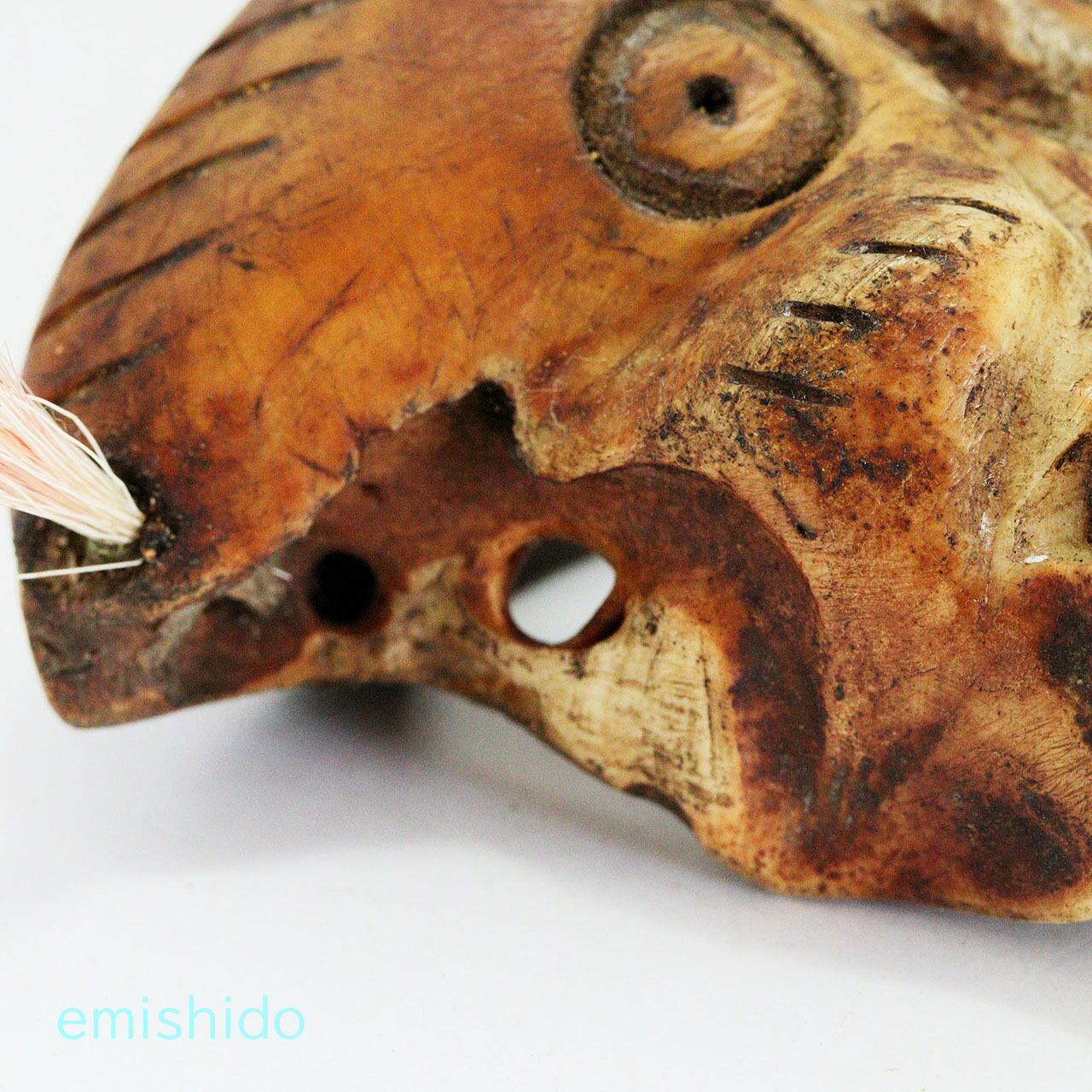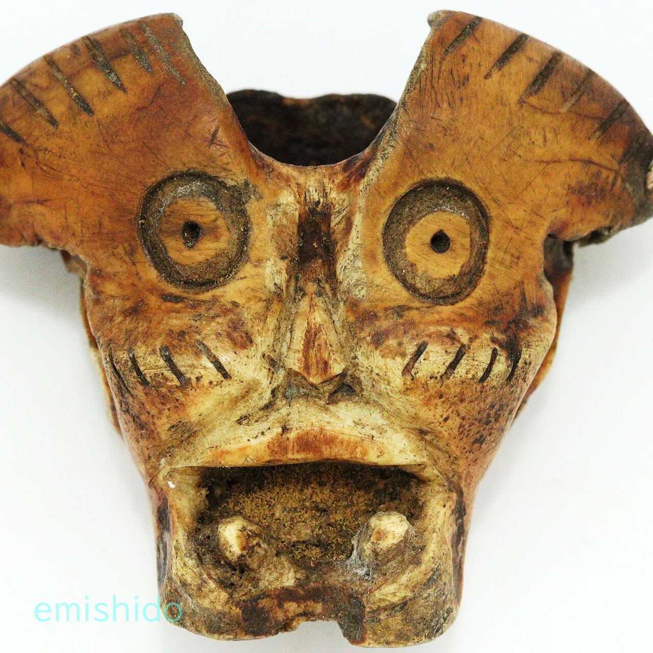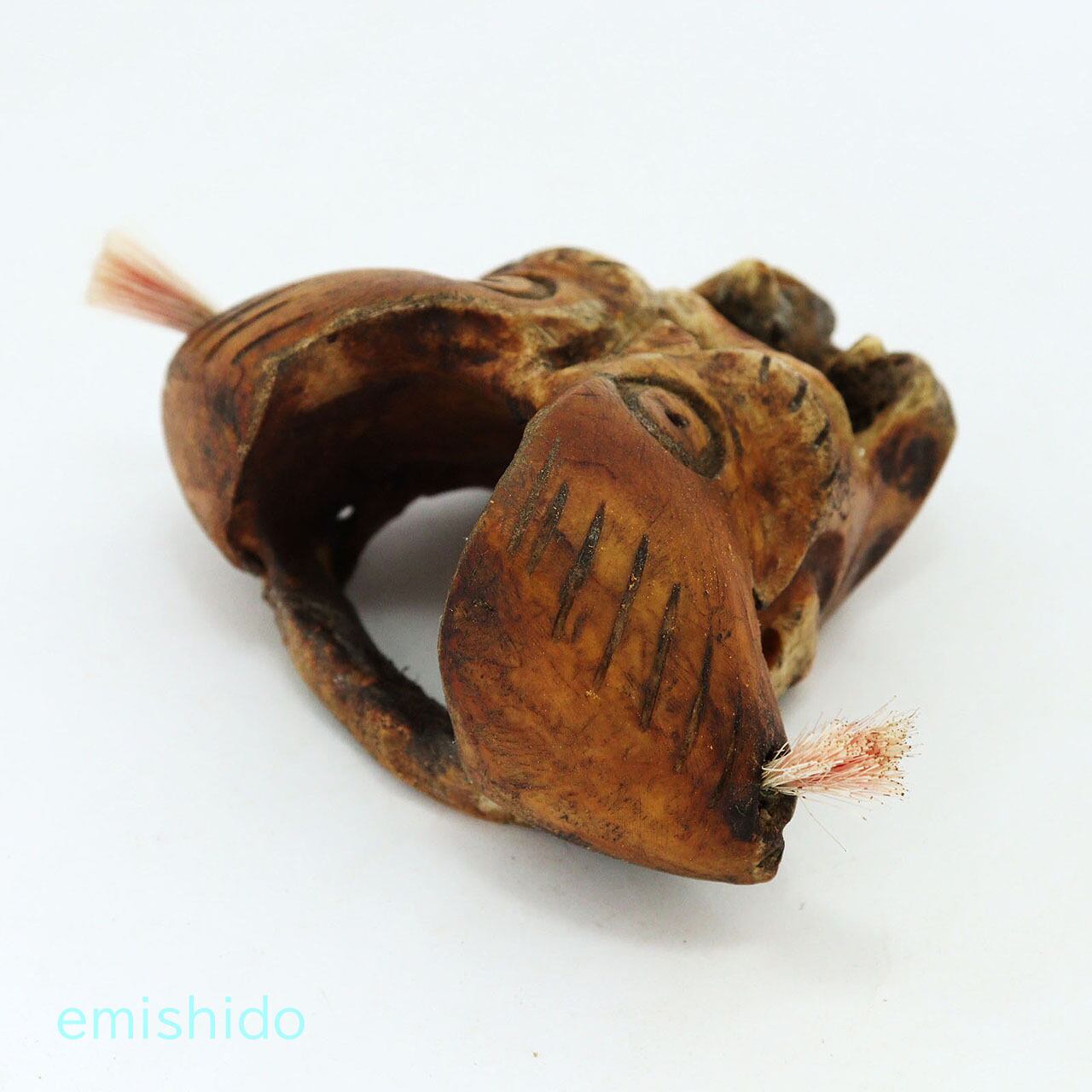 他の作品でもこの部位を使ったトップがありますが、この作者は頬骨が目立つ顔に見えたようで、眼を描きアングリ開けた口を彫っています。