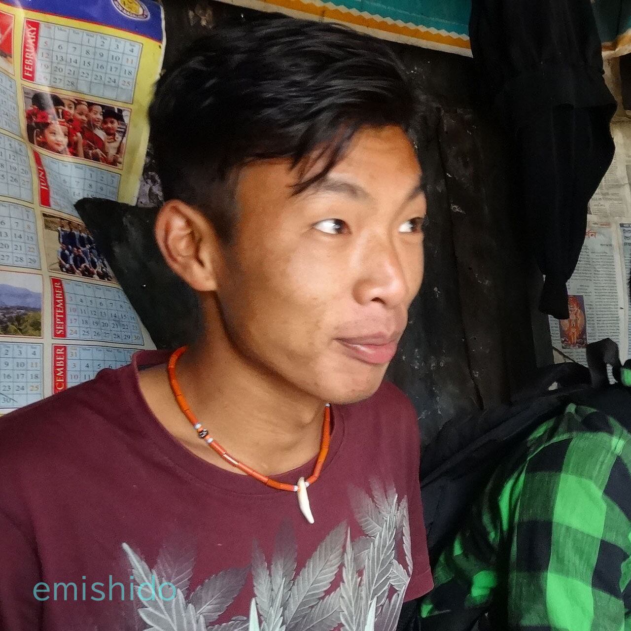頭(顔)を表したトップは、ナガ族の伝統的なデザインです。かつて首狩りをした者のみが許される勇者の証です。そんないわくつきのデザインですが、ビックリまなこに、牙こそ生えていますがアングリ開けた口からはひょうきんな印象が生まれています。一筋縄ではいかないナガのセンスがうかがえます。