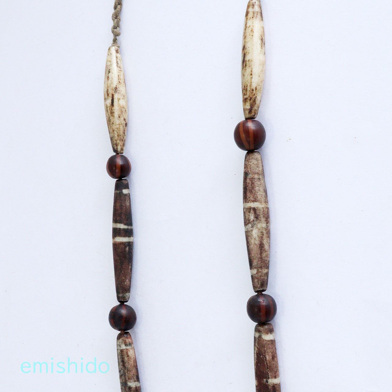 紐の部分のビーズはミャンマーやナガ族のアクセサリーで時々見かけるプンテックビーズ(椰子の木の化石から作られているそうです)。渋い色合いで統一されておしゃれです。