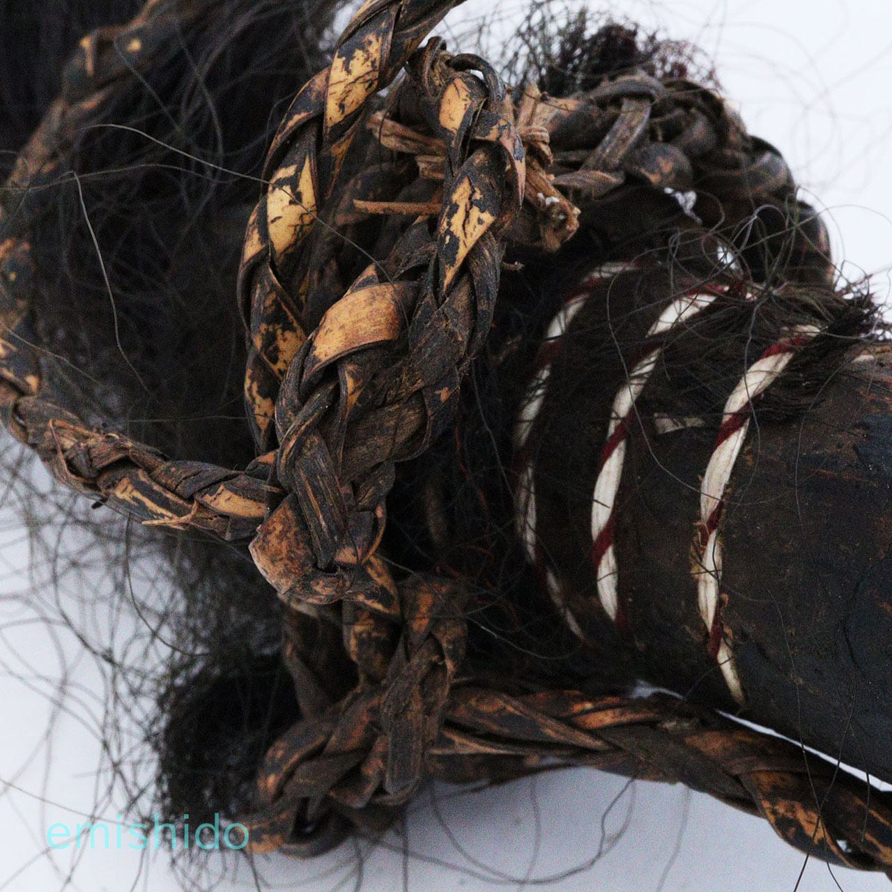 そして縮れ毛の具合から人の頭髪と思われる飾り房がついた腰飾りになっています。(バッグの飾りかもしれません)敵対する女性の首からはこのような飾り房が得られるし、村から最大限の保護を与えられていた女性の首を狩ることは勇者の証でもあったそうです。