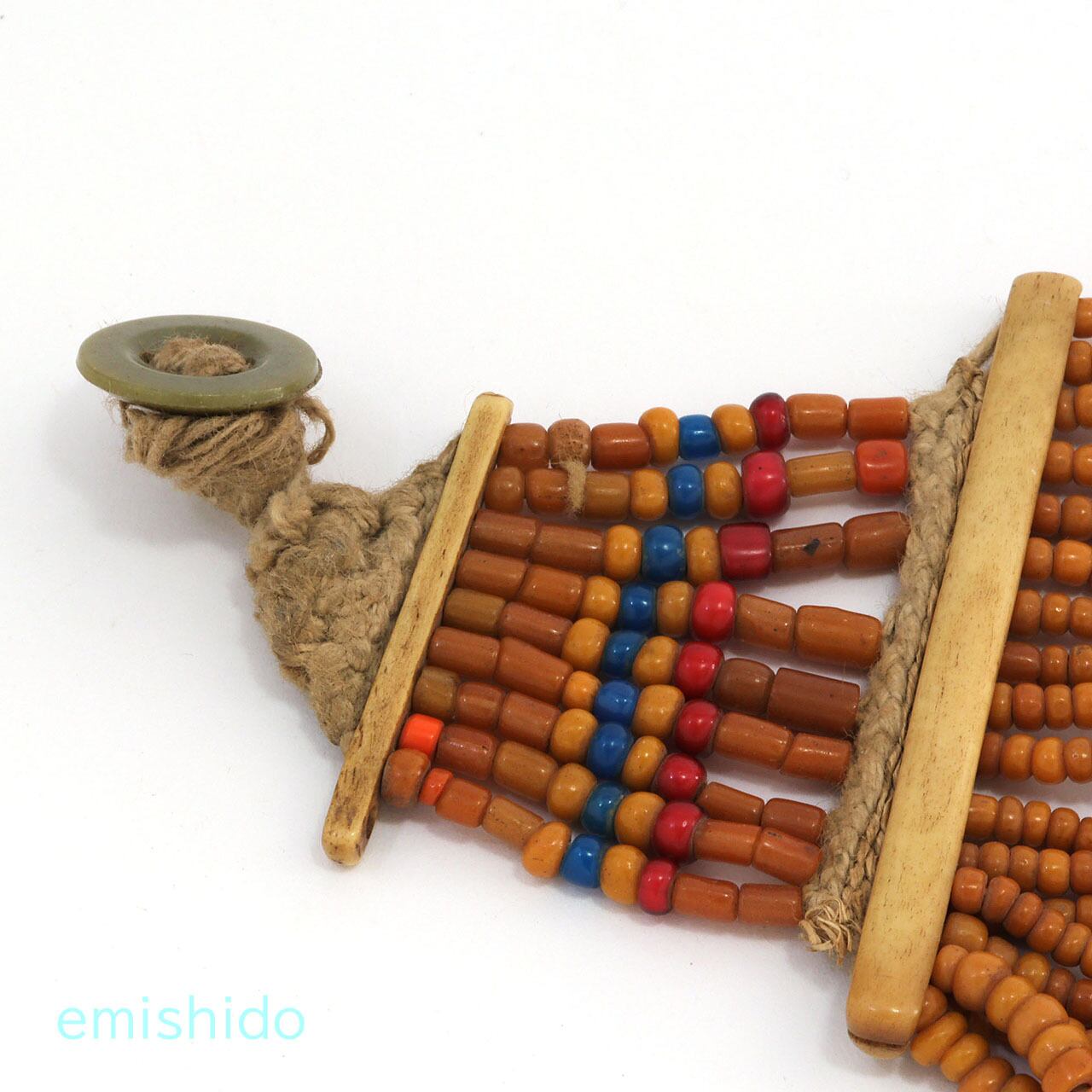 伝統的な基本パターンがあると思いますが、センターのビーズ配色と組み合わせ(さりげなく一個だけ黄緑を配して憎いです)、骨のスペーサーで区切られたそれぞれのパーツも抑制が効いた色使いできれいです。